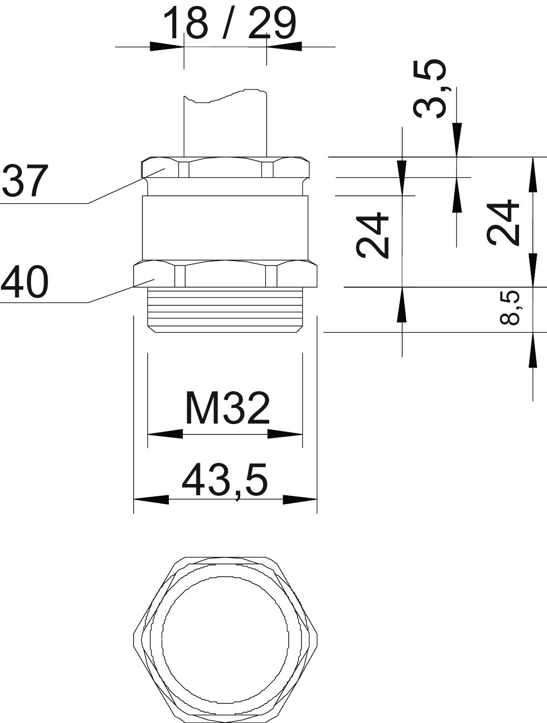 Aizsardzība pret lieci nē Aizsardzības veids IP65 aizsargāta pret eksploziju nē Ar pretuzgriezni nē Atslēgas platums 1 40 mm Atslēgas platums 2 37 mm Blīvējuma veids izgriežams blīvgredzens Blīvējuma virsma D maks. 29 mm Blīvējuma virsma D min. 18 mm CO2 pēdas nospiedums (GWP) no šūpuļa līdz vārtiem 0,1389 kg CO2e / 1 Gabals Daudzvietīgs blīvēšanas ieliktnis nē Iespēja atbrīvot no sprieguma nē Izmērs L, maks. 24 mm Izmērs M32 Izmērs e 43,5 mm Izmērs L 24 mm Izmērs L1 8,5 mm Izmērs L2 24 mm Izmērs L3 3,5 mm Materiāls misiņa Nesatur halogēnus nē Plakanvada skrūvsavienojums nē sprādzienbīstamai zonai bez Stiegrots ar stikla šķiedru nē Triecienizturīgs nē Virsma Niķelēts Vītne M32 x 1,5 Vītnes garums 8,5 mm Vītnes veids metrisks - Visi tipi