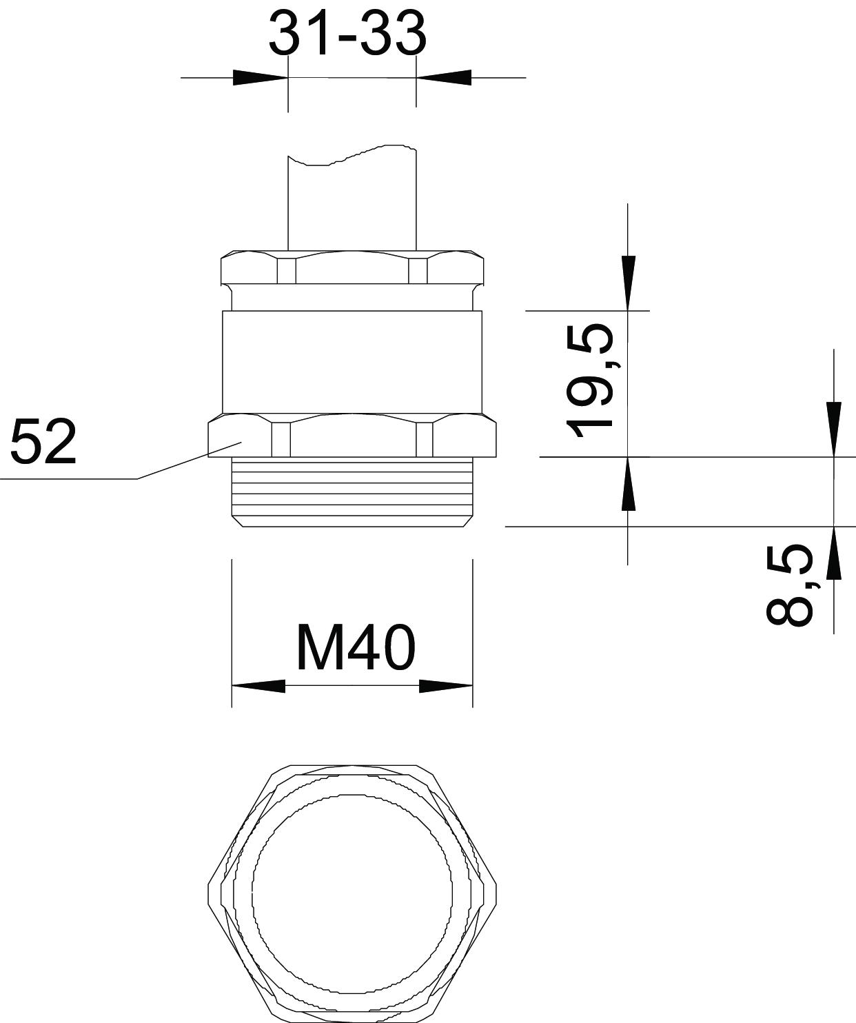 Aizsardzība pret lieci nē Aizsardzības veids IP54 aizsargāta pret eksploziju nē Ar pretuzgriezni nē Atslēgas platums 1 52 mm Atslēgas platums 2 47 mm Blīvējuma veids Blīvgredzens Blīvējuma virsma D maks. 33 mm Blīvējuma virsma D min. 31 mm CO2 pēdas nospiedums (GWP) no šūpuļa līdz vārtiem 0,4 kg CO2e / 1 Gabals Daudzvietīgs blīvēšanas ieliktnis nē Iespēja atbrīvot no sprieguma nē Izmērs M40 Izmērs e 54 mm Izmērs L1 8,5 mm Izmērs L2 19,5 mm Materiāls misiņa Nesatur halogēnus nē Plakanvada skrūvsavienojums nē sprādzienbīstamai zonai bez Stiegrots ar stikla šķiedru nē Triecienizturīgs nē Virsma Niķelēts Vītne M40 x 1,5 Vītnes garums 8,5 mm Vītnes veids metrisks - Visi tipi