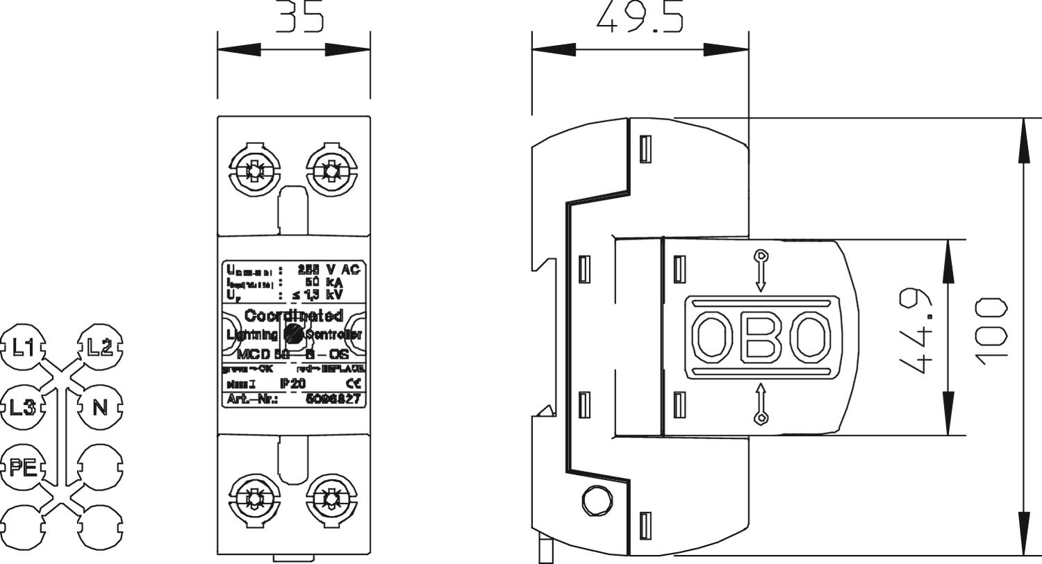 • Zibensizlādes strāvas novadīšanas spēja 50 kA (10/350) katrā polā, bet kopā līdz 150 kA (10/350)