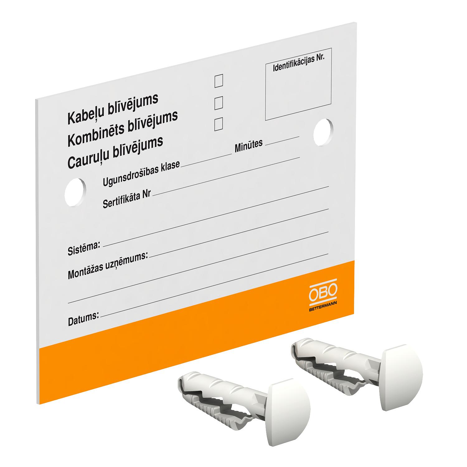 Produkta aprakstsMarķējuma plāksnīte aizpildīšanai ar ūdensizturīgu un neizbalojošu flomāsteru, paredzēta ugunsdrošiem kabeļu caurvadiem, ar 2 iespraužamiem dībeļiem.