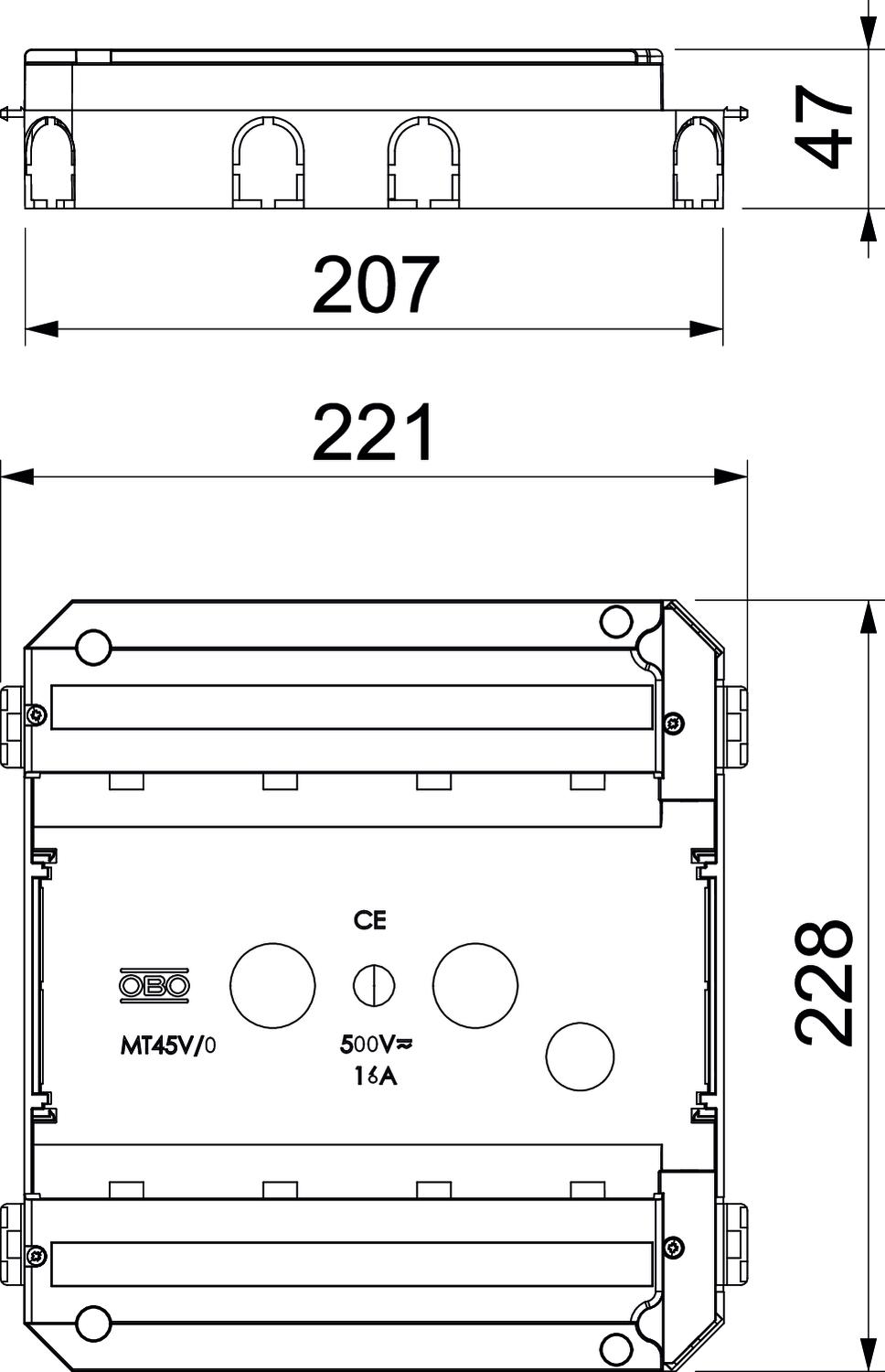 Iebūvējams ietvers MT45V moduļa 45 ierīču un montāžas plāksnes MPMT45 iemontēšanai datu pārraides ligzdām var pasūtīt atsevišķi. Caurumiem sānu sienā cauruļu ievadei diametrs ir 21 mm.