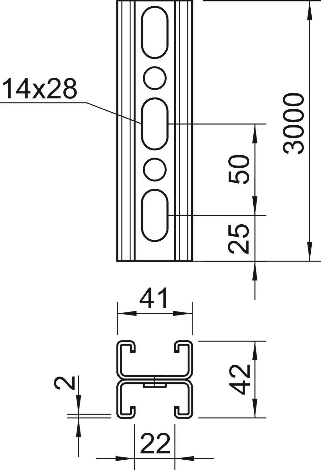Produkta aprakstsProfila/montāžas sliede ar vienlaidus perforētu pamatni, liela svara izpildījuma variants, spraugas platums 22 mm. Divkāršā konstrukcija, tas ir, divas profila sliedes ir savstarpēji savienotas (iespiestais savienojums).