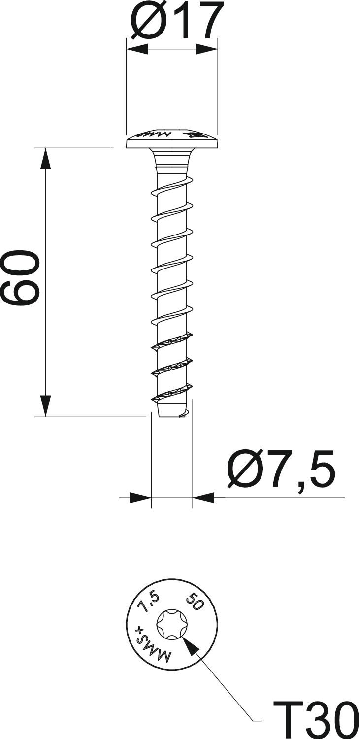 Dībeļa garums 60 mm Fire resistance class EN 13501-1 R30, R60, R90, R120 Galvas diametrs 17 mm Galvas forma Cup head Garums 60 mm Iespīlēšanas biezums 25 mm Izmēri 7,5 x 60 Izmērs 7,5x60 Izmērs L 60 mm Krāsa cinks Materiāls Tērauds Rūdīts jā Skrūvēšanas sistēma Torx Urbtā cauruma diametrs min. 6 mm Urbtā cauruma dziļums 40 mm Virsma cinkota Vītne 7,5 Vītnes diametrs ST 7,5 - Visi tipi