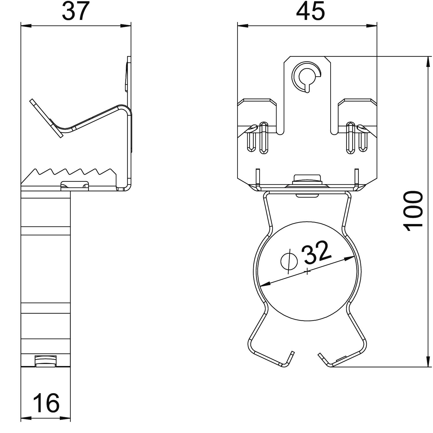 Ar eņģēm nē Atloka biezums F maks. 20 mm Atloka biezums F min. 14 mm Augstums 36 mm Caurules/kabeļa diametrs maks. 32 mm Caurules/kabeļa diametrs min. 30 mm Eņģes, regulējamas nē Garums 100 mm Izmērs 14-20mm Izmērs L 100 mm Krāsa cinks Materiāls Tērauds Min. pārraušanas spēks 0,45 kN Pievienojuma veids / būvdetaļa Caurule/kabelis Platums 45 mm Stiprinājuma veids Spailes Virsma Cinka lamele - Visi tipi