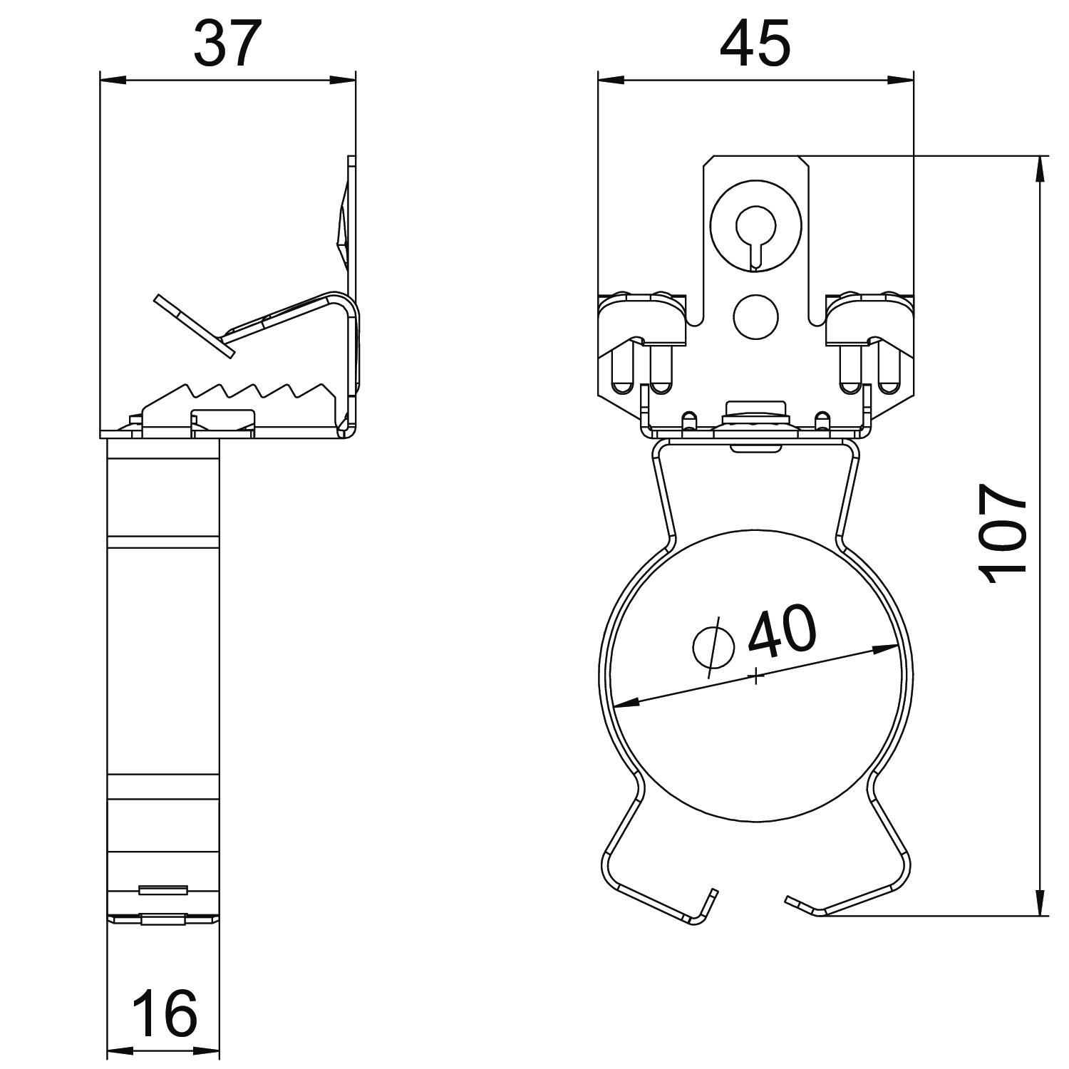 Ar eņģēm nē Atloka biezums F maks. 13 mm Atloka biezums F min. 7 mm Augstums 37 mm Caurules/kabeļa diametrs maks. 40 mm Caurules/kabeļa diametrs min. 36 mm Eņģes, regulējamas nē Garums 110 mm Izmērs 7-13mm Izmērs L 107 mm Krāsa cinks Materiāls Tērauds Min. pārraušanas spēks 0,45 kN Pievienojuma veids / būvdetaļa Caurule/kabelis Platums 45 mm Stiprinājuma veids Spailes Virsma Cinka lamele - Visi tipi