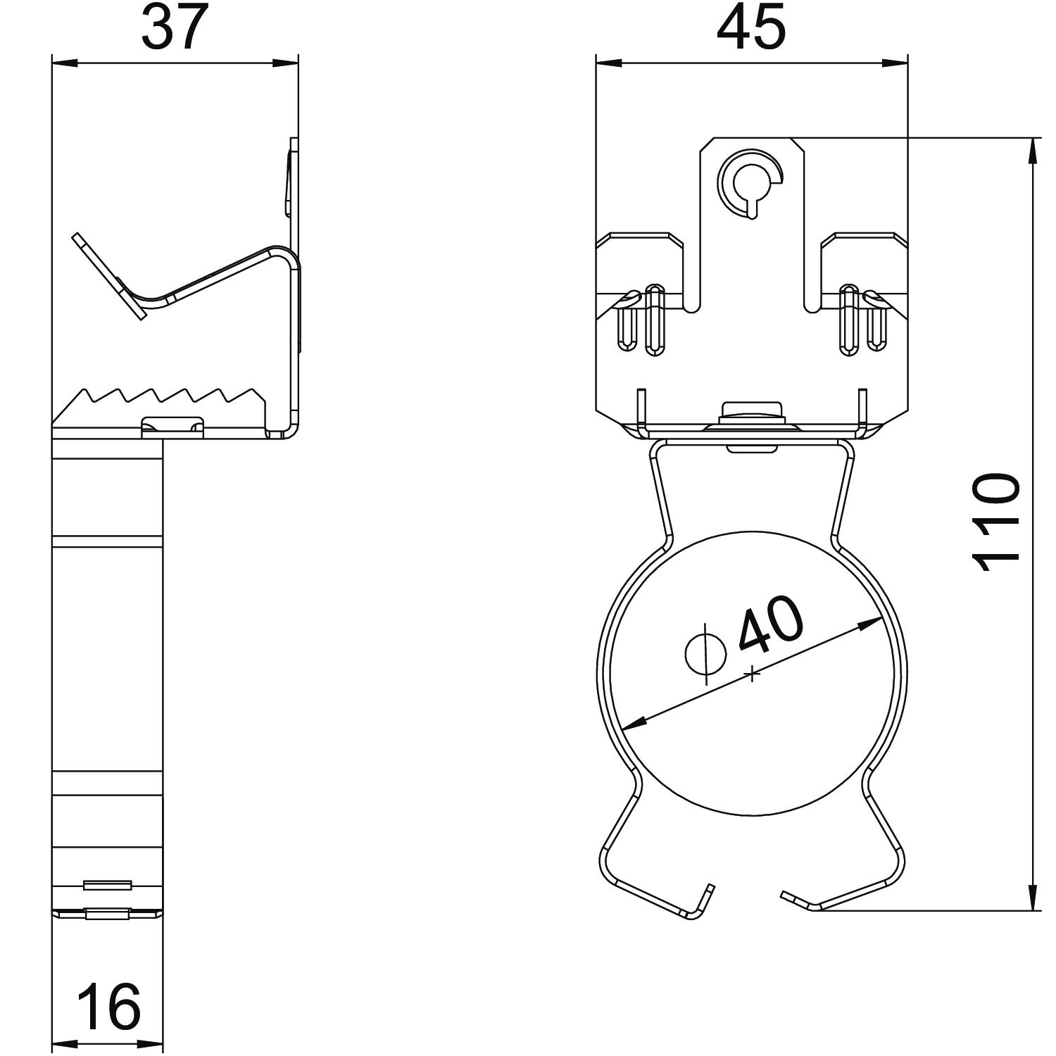 Ar eņģēm nē Atloka biezums F maks. 20 mm Atloka biezums F min. 14 mm Augstums 36 mm Caurules/kabeļa diametrs maks. 40 mm Caurules/kabeļa diametrs min. 36 mm Eņģes, regulējamas nē Garums 113 mm Izmērs 14-20mm Izmērs L 110 mm Krāsa cinks Materiāls Tērauds Min. pārraušanas spēks 0,45 kN Pievienojuma veids / būvdetaļa Caurule/kabelis Platums 45 mm Stiprinājuma veids Spailes Virsma Cinka lamele - Visi tipi