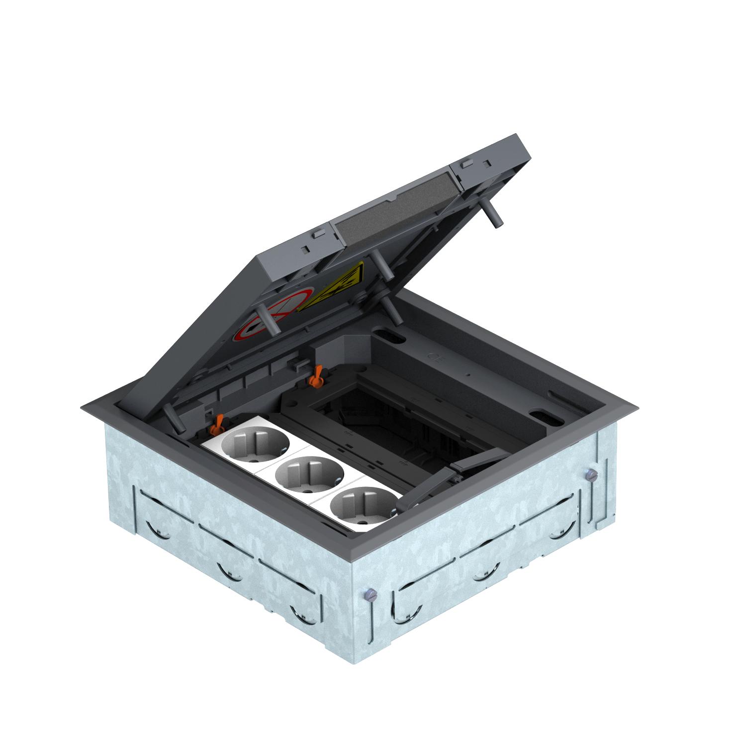 Produkta aprakstsKvadrātveida iebūvējama vienība sešām Modul 45 instalējamām ierīcēm, montāža dobās grīdās un betona grīdās ar sauso kopšanu iekštelpās, to veido montāžas korpuss, ierīču kārba GES4-2, divi universālie balsti UT un viena trīsvietīga iezemēta kontaktligzda 33° baltā krāsā. Montāžas korpuss ar cauruļvadu (M25) montāžai sagatavotām ieejas atverēm, regulējams atbilstoši betona grīdas augšējai malai. Piegādes stāvoklī montāžas korpuss ir noslēgts ar slēgtu montāžas vāku. Ierīču kārbu pēc betonēšanas var ievietot izveidotajā montāžas atverē. Ierīču kārbas atveramajā vākā izveidots 3, 5, 8 vai 10 mm izgriezums grīdas segumam.