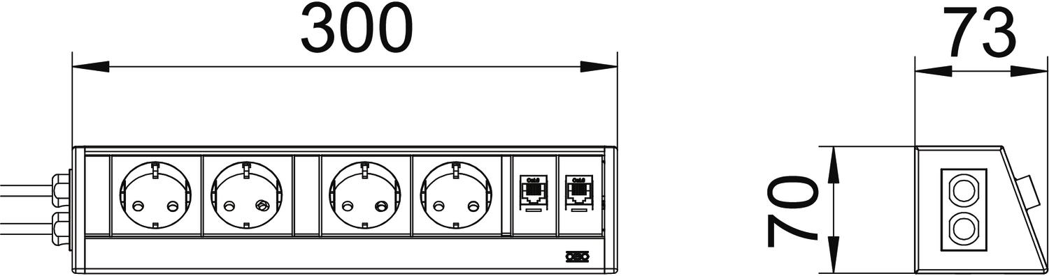 - divi datu pārsūtīšanas tehnikas savienojumi RJ45 uz RJ45, 1:1 saslēgts, kat. 6 ekranēts, kabeļa izvads labajā korpusa pārsegā.