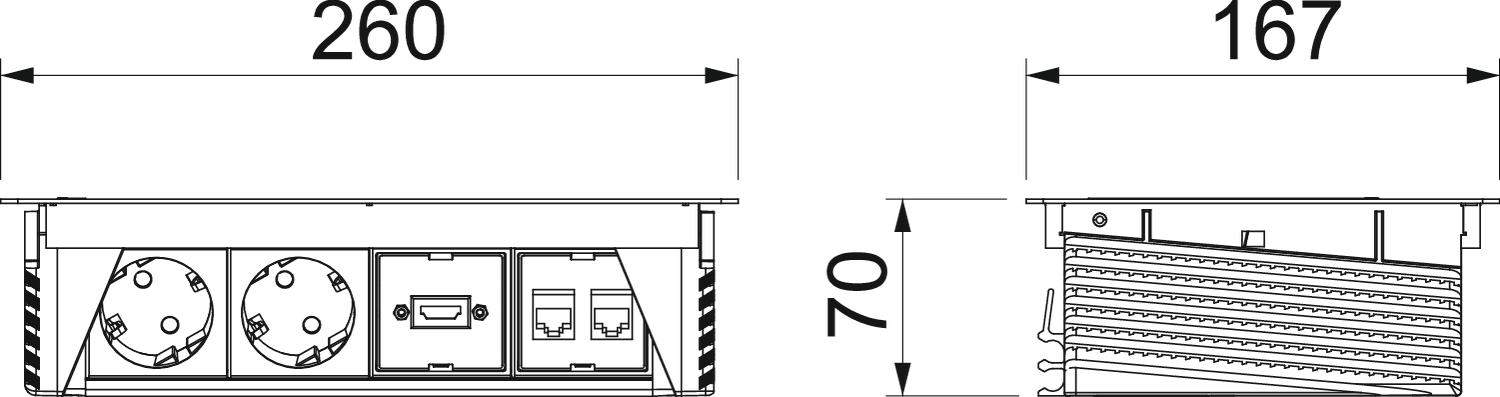 Garums 260 mm HDMI pieslēgumu skaits 1 Iebūvēšanas dziļums 68 mm Izmērs 260x167x68 Izvelkams nē Materiāls Nerūsējošais tērauds 1.4301 Pārspriegumaizsardzība nē Pieslēgumu skaits, CAT 6 2 Pievada garums 3 m SCHUKO kontaktligzdu skaits 2 Uzlocīts jā - Visi tipi