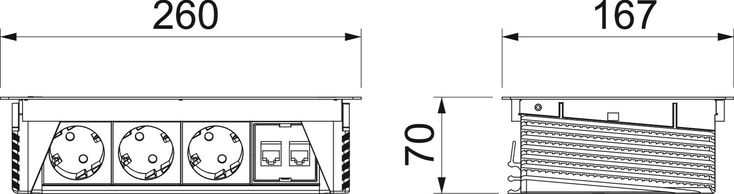 Garums 260 mm Iebūvēšanas dziļums 68 mm Izmērs 260x167x68 Izvelkams nē Materiāls Nerūsējošais tērauds 1.4301 Pārspriegumaizsardzība nē Pieslēgumu skaits, CAT 6 2 Pievada garums 3 m SCHUKO kontaktligzdu skaits 3 Uzlocīts jā - Visi tipi