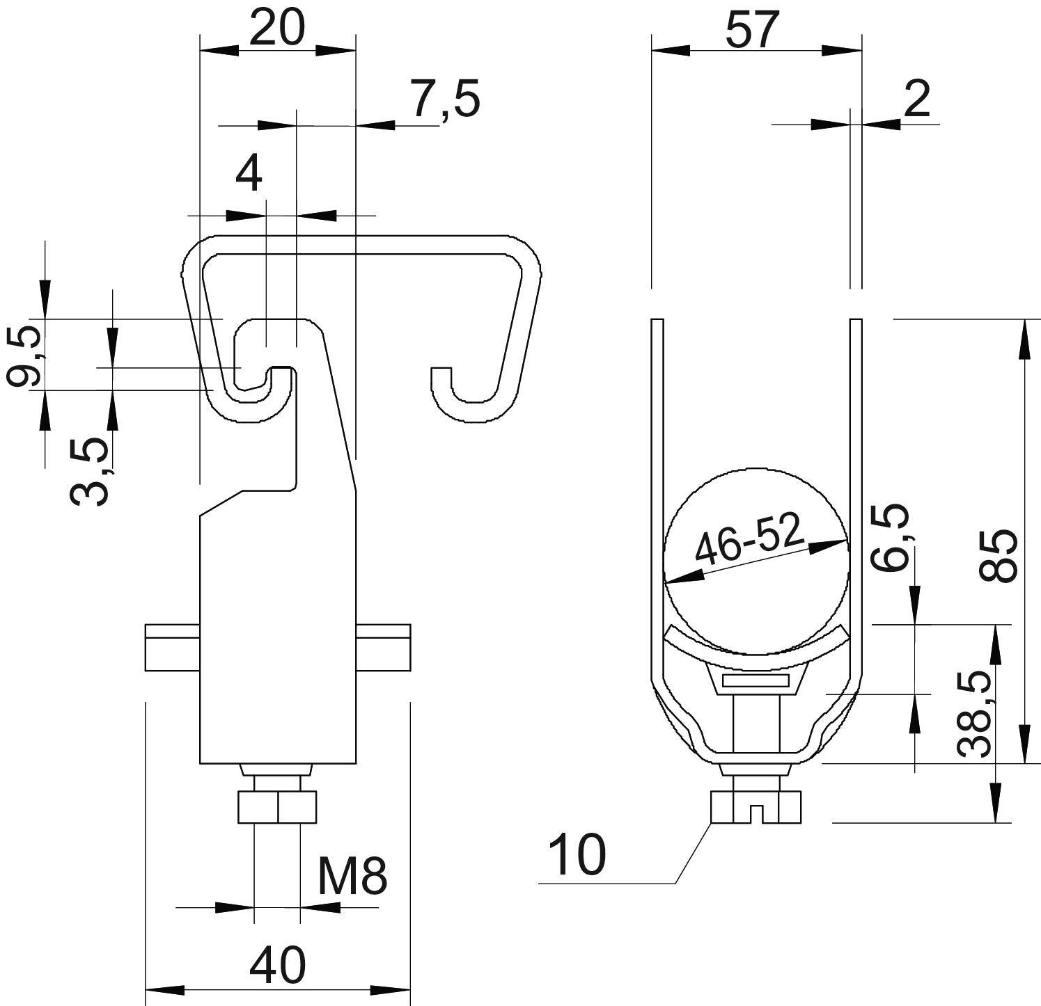 2 kabeļiem H 140 mm 2 kabeļiem L 45,5 mm Ar metāla padziļinājumu nē Ar plastmasas padziļinājumu jā Ar prettvertni nē caurules diametram maks. 50 mm caurules diametram min. 50 mm CO2 pēdas nospiedums (GWP) no šūpuļa līdz vārtiem 0,1857 kg CO₂e / 1 Gabals Izmērs 46-52mm Izmērs A 20 mm Izmērs B 57 mm Izmērs C 40 mm Izmērs G (mm) M8 Izmērs H 85 mm Izmērs L 38,5 mm Izmērs t 2 mm Izmērs x 6,5 mm Kabeļu/ cauruļu skaits 1 Maks. Pievilkšanas griezes moments 5 Nm Materiāls Tērauds Montāžas veids Profila sliede Nesatur halogēnus jā Papildu materiāls Tērauds Papildu virsma karsti cinkota paredzēts 1 kabelim H 85 mm paredzēts 1 kabelim L 38,5 sliedēm ar griezuma diametru (ar intervālu) maks. 22 mm sliedēm ar griezuma diametru (ar intervālu) min. 18 mm Spriegošanas diapazons D maks. 52 mm Spriegošanas diapazons D min. 46 mm Triecienizturīgs nē Vannas materiāla kvalitāte Polipropilēns Vannas materiāls Plastmasa Virsma karsti cinkots - Visi tipi