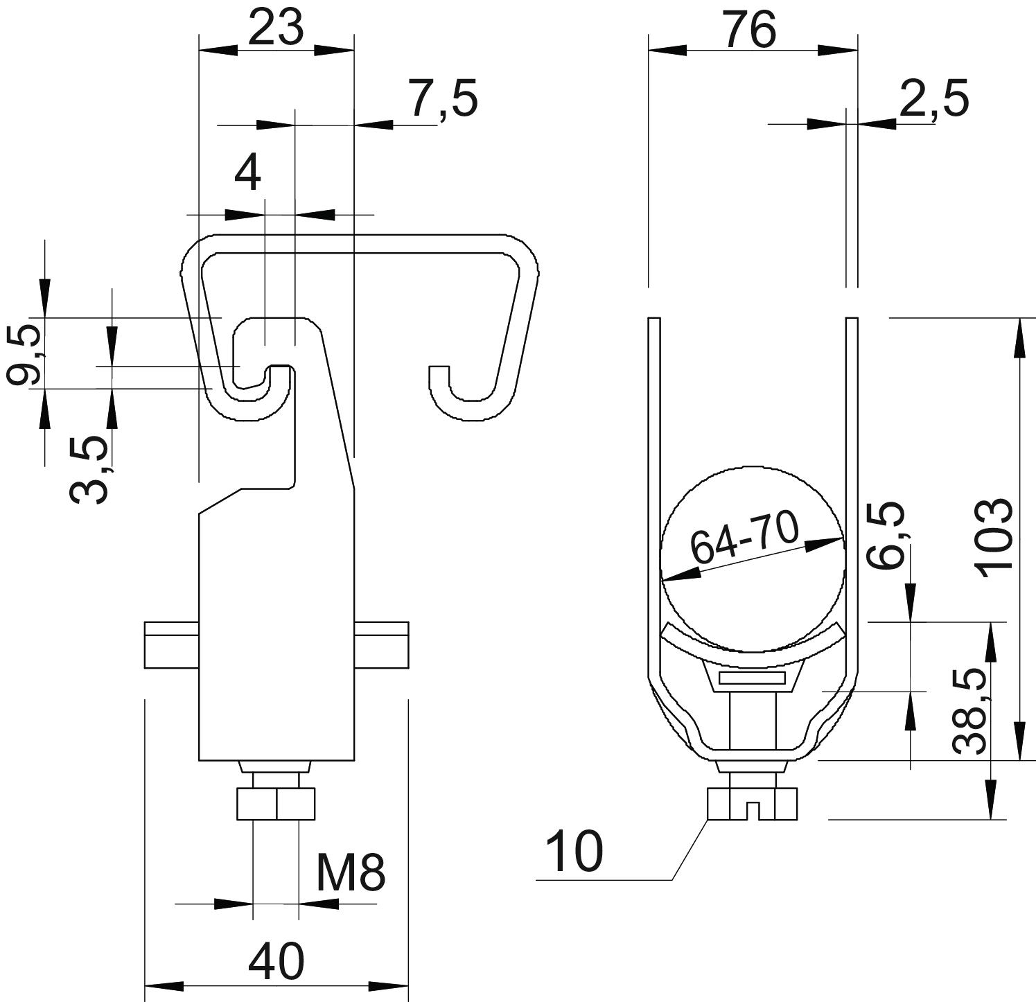 Ar metāla padziļinājumu nē Ar plastmasas padziļinājumu jā Ar prettvertni nē CO2 pēdas nospiedums (GWP) no šūpuļa līdz vārtiem 0,2729 kg CO₂e / 1 Gabals Izmērs 64-70mm Izmērs A 23 mm Izmērs B 76 mm Izmērs C 40 mm Izmērs G (mm) M8 Izmērs H 103 mm Izmērs L 38,5 mm Izmērs t 2,5 mm Izmērs x 6,5 mm Kabeļu/ cauruļu skaits 1 Maks. Pievilkšanas griezes moments 5 Nm Materiāls Tērauds Montāžas veids Profila sliede Nesatur halogēnus jā Papildu materiāls Tērauds Papildu virsma karsti cinkota paredzēts 1 kabelim H 103 mm paredzēts 1 kabelim L 38,5 sliedēm ar griezuma diametru (ar intervālu) maks. 22 mm sliedēm ar griezuma diametru (ar intervālu) min. 18 mm Spriegošanas diapazons D maks. 70 mm Spriegošanas diapazons D min. 64 mm Triecienizturīgs nē Vannas materiāla kvalitāte Polipropilēns Vannas materiāls Plastmasa Virsma karsti cinkots - Visi tipi