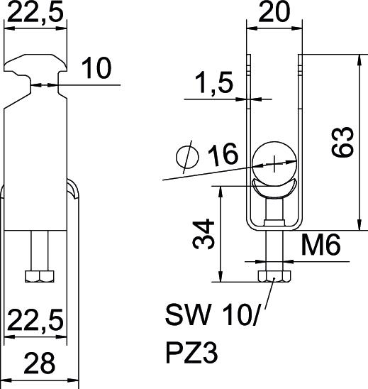 Produkta aprakstsPiekarapskava ar āmurveida kāju, metāla spiediena padziļinājums ar noapaļotām malām kabeļu aizsardzībai. 2 atsevišķu kabeļu vertikālai un horizontālai montāžai pie C veida profila sliedes. Griezuma diametram 16–17 mm. Ar viengājiena skrūvi pie spiediena padziļinājuma, universāla sešstūru skrūves galviņa SW10, ar rievu un krustiņu. Piemērota montāžai telpās un ārpus telpām. Vairāki kabeļi jāatdala ar dubultpadziļinājumiem. Ieteicams izmantot pretpadziļinājumu.