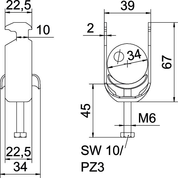 Ar metāla padziļinājumu jā Ar plastmasas padziļinājumu nē Ar prettvertni nē Ārējā izmēra garums 34 mm Augstums 67 mm caurules diametram maks. 34 mm caurules diametram min. 28 mm CO2 pēdas nospiedums (GWP) no šūpuļa līdz vārtiem 0,1706 kg CO2e / 1 Gabals Funkciju nodrošināšana jā Garums 22,5 mm griezuma diametrs 10 mm Izmērs 28-34mm Izmērs A 22,5 mm Izmērs B 39 mm Izmērs C 34 mm Izmērs G (mm) M6 Izmērs H 67 mm Izmērs L 46 mm Izmērs t 2 mm Kabeļu/ cauruļu skaits 1 Loksnes biezums 2 mm Maks. Pievilkšanas griezes moments 3 Nm Materiāls Tērauds Montāžas veids Profila sliede Nesatur halogēnus jā Papildu materiāls Tērauds Papildu virsma karsti cinkota Platums 39 mm sliedēm ar griezuma diametru (ar intervālu) maks. 17 mm sliedēm ar griezuma diametru (ar intervālu) min. 16 mm Spriegošanas diapazons D maks. 34 mm Spriegošanas diapazons D min. 28 mm Vannas materiāls Tērauds Virsma karsti cinkots Vītne M6 - Visi tipi