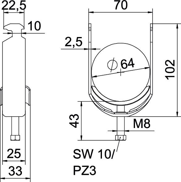 Ar metāla padziļinājumu jā Ar plastmasas padziļinājumu nē Ar prettvertni nē Ārējā izmēra garums 33 mm Augstums 102 mm caurules diametram maks. 64 mm caurules diametram min. 58 mm CO2 pēdas nospiedums (GWP) no šūpuļa līdz vārtiem 0,3627 kg CO2e / 1 Gabals Funkciju nodrošināšana jā Garums 25 mm griezuma diametrs 10 mm Izmērs 58-64mm Izmērs A 25 mm Izmērs B 70 mm Izmērs C 33 mm Izmērs G (mm) M8 Izmērs H 102 mm Izmērs L 43 mm Izmērs t 2,5 mm Kabeļu/ cauruļu skaits 1 Loksnes biezums 2,5 mm Maks. Pievilkšanas griezes moments 5 Nm Materiāls Tērauds Montāžas veids Profila sliede Nesatur halogēnus jā Papildu materiāls Tērauds Papildu virsma karsti cinkota Platums 70 mm sliedēm ar griezuma diametru (ar intervālu) maks. 17 mm sliedēm ar griezuma diametru (ar intervālu) min. 16 mm Spriegošanas diapazons D maks. 64 mm Spriegošanas diapazons D min. 58 mm Vannas materiāls Tērauds Virsma karsti cinkots Vītne M8 - Visi tipi