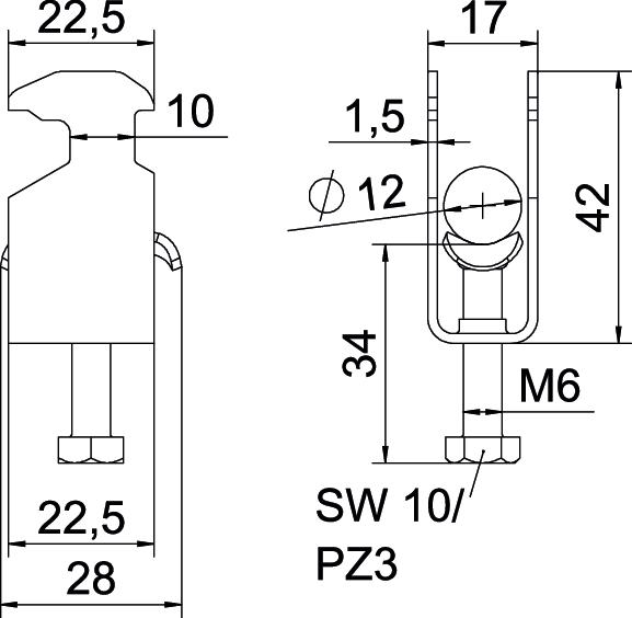 Ar metāla padziļinājumu jā Ar plastmasas padziļinājumu nē Ar prettvertni nē Ārējā izmēra garums 28 mm Augstums 42 mm caurules diametram maks. 12 mm caurules diametram min. 8 mm CO2 pēdas nospiedums (GWP) no šūpuļa līdz vārtiem 0,0877 kg CO2e / 1 Gabals Funkciju nodrošināšana jā Garums 22,5 mm griezuma diametrs 10 mm Izmērs 08-12mm Izmērs A 22,5 mm Izmērs B 17 mm Izmērs C 28 mm Izmērs G (mm) M6 Izmērs H 42 mm Izmērs L 34 mm Izmērs t 1,5 mm Kabeļu/ cauruļu skaits 1 Loksnes biezums 1,5 mm Maks. Pievilkšanas griezes moments 3 Nm Materiāls Tērauds Montāžas veids Profila sliede Nesatur halogēnus jā Papildu materiāls Tērauds Papildu virsma karsti cinkota Platums 17 mm sliedēm ar griezuma diametru (ar intervālu) maks. 17 mm sliedēm ar griezuma diametru (ar intervālu) min. 16 mm Spriegošanas diapazons D maks. 12 mm Spriegošanas diapazons D min. 8 mm Vannas materiāls Tērauds Virsma karsti cinkots Vītne M6 - Visi tipi