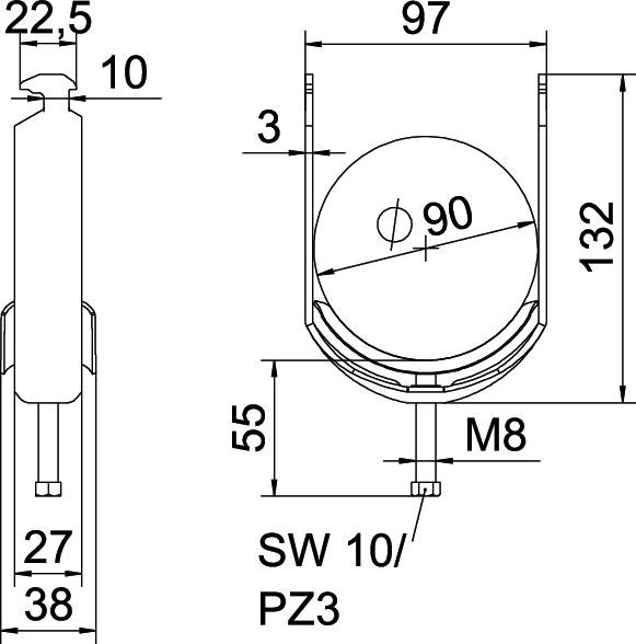 Ar metāla padziļinājumu jā Ar plastmasas padziļinājumu nē Ar prettvertni nē Ārējā izmēra garums 38 mm Augstums 132 mm caurules diametram maks. 90 mm caurules diametram min. 82 mm CO2 pēdas nospiedums (GWP) no šūpuļa līdz vārtiem 0,7187 kg CO2e / 1 Gabals Funkciju nodrošināšana jā Garums 27 mm griezuma diametrs 10 mm Izmērs 82-90mm Izmērs A 27 mm Izmērs B 97 mm Izmērs C 38 mm Izmērs G (mm) M8 Izmērs H 132 mm Izmērs L 55 mm Izmērs t 3 mm Kabeļu/ cauruļu skaits 1 Loksnes biezums 3 mm Maks. Pievilkšanas griezes moments 5 Nm Materiāls Tērauds Montāžas veids Profila sliede Nesatur halogēnus jā Papildu materiāls Tērauds Papildu virsma karsti cinkota Platums 97 mm sliedēm ar griezuma diametru (ar intervālu) maks. 17 mm sliedēm ar griezuma diametru (ar intervālu) min. 16 mm Spriegošanas diapazons D maks. 90 mm Spriegošanas diapazons D min. 82 mm Vannas materiāls Tērauds Virsma karsti cinkots Vītne M8 - Visi tipi