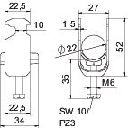 Produkta aprakstsPiekarapskava ar āmurveida kāju, plastmasas spiediena padziļinājums no polipropilēna. 1 atsevišķa kabeļa vertikālai un horizontālai montāžai pie C veida profila sliedes. Griezuma diametram 16–17 mm. Ar viengājiena skrūvi pie spiediena padziļinājuma, universāla sešstūru skrūves galviņa SW10, ar rievu un krustiņu. Piemērota montāžai telpās un ārpus telpām. Ieteicams izmantot pretpadziļinājumu.