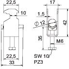 Produkta aprakstsPiekarapskava ar āmurveida kāju, plastmasas spiediena padziļinājums no polipropilēna. 1 atsevišķa kabeļa vertikālai un horizontālai montāžai pie C veida profila sliedes. Griezuma diametram 16–17 mm. Ar viengājiena skrūvi pie spiediena padziļinājuma, universāla sešstūru skrūves galviņa SW10, ar rievu un krustiņu. Piemērota montāžai telpās un ārpus telpām. Ieteicams izmantot pretpadziļinājumu.