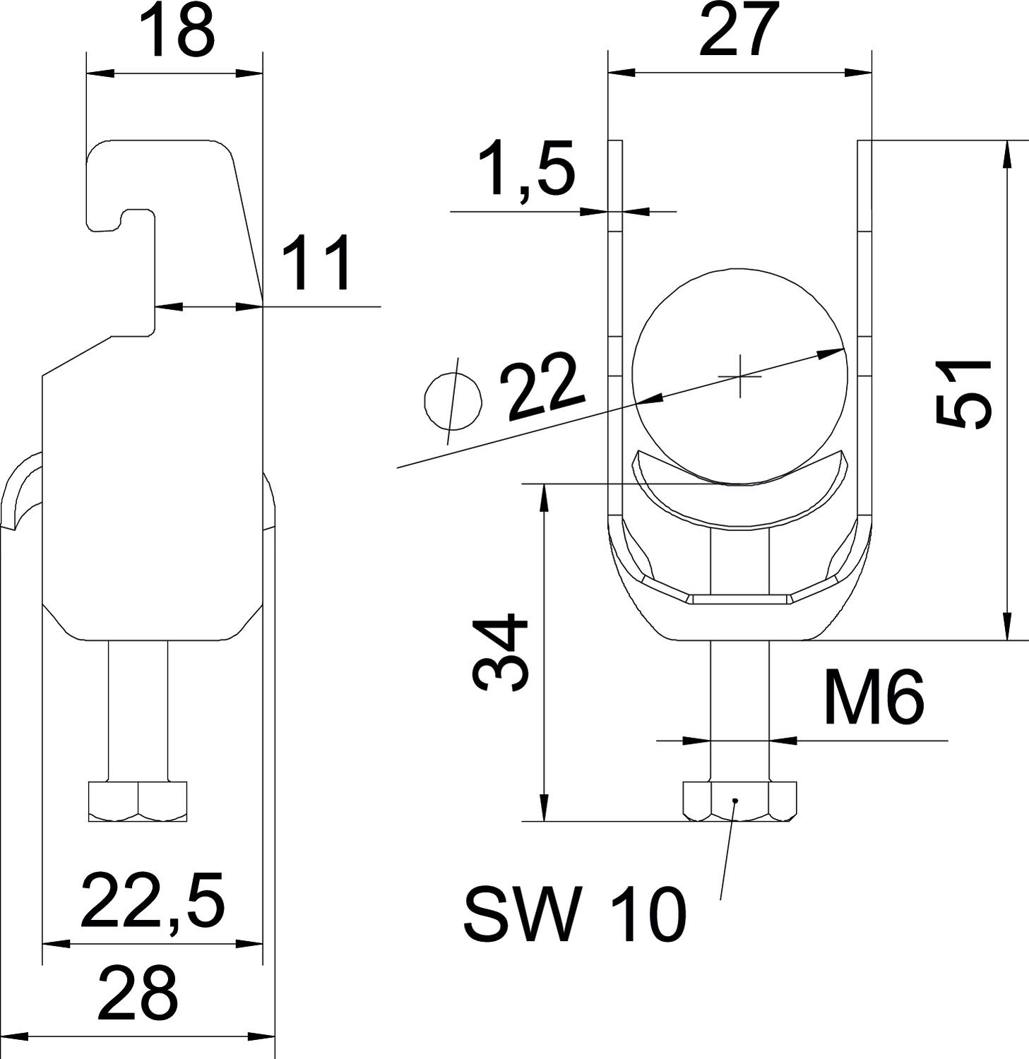 Produkta aprakstsPiekarapskava ar U veida kāju, metāla spiediena padziļinājums ar noapaļotām malām kabeļu aizsardzībai. 1 atsevišķa kabeļa vertikālai un horizontālai montāžai pie C veida profila sliedes. Griezuma diametram 18-22 mm. Ar viengājiena skrūvi pie spiediena padziļinājuma, universāla sešstūru skrūves galviņa SW10, ar rievu un krustiņu. Piemērota montāžai telpās un ārpus telpām. Ieteicams izmantot pretpadziļinājumu.