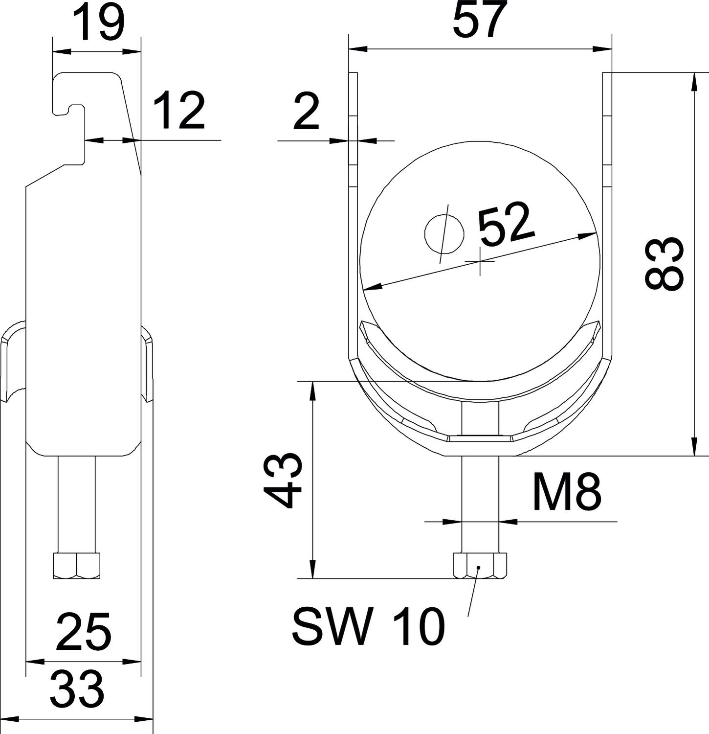 Ar metāla padziļinājumu jā Ar prettvertni nē Ārējā izmēra garums 33 mm Augstums 83 mm caurules diametram maks. 52 mm caurules diametram min. 46 mm CO2 pēdas nospiedums (GWP) no šūpuļa līdz vārtiem 0,2624 kg CO2e / 1 Gabals Funkciju nodrošināšana jā Garums 25 mm griezuma diametrs 10 mm Izmērs 46-52mm Izmērs A 25 mm Izmērs B 57 mm Izmērs C 33 mm Izmērs G (mm) M8 Izmērs H 83 mm Izmērs L 43 mm Izmērs t 2 mm Kabeļu/ cauruļu skaits 1 Loksnes biezums 2 mm Maks. Pievilkšanas griezes moments 5 Nm Materiāls Tērauds Montāžas veids Profila sliede Nesatur halogēnus jā Papildu materiāls Tērauds Papildu virsma karsti cinkota Platums 57 mm sliedēm ar griezuma diametru (ar intervālu) maks. 22 mm sliedēm ar griezuma diametru (ar intervālu) min. 18 mm Spriegošanas diapazons D maks. 52 mm Spriegošanas diapazons D min. 46 mm Vannas materiāls Tērauds Virsma karsti cinkots Vītne M8 - Visi tipi