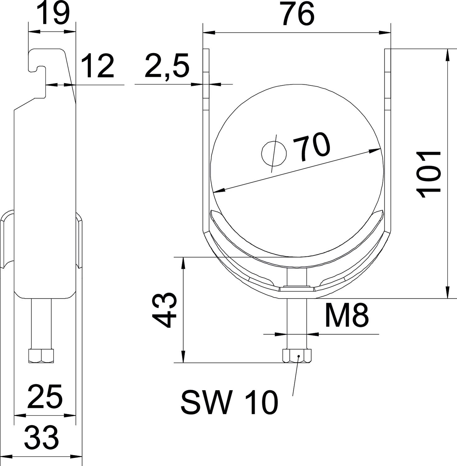 Ar metāla padziļinājumu jā Ar prettvertni nē Ārējā izmēra garums 33 mm Augstums 101 mm caurules diametram maks. 70 mm caurules diametram min. 64 mm CO2 pēdas nospiedums (GWP) no šūpuļa līdz vārtiem 0,374 kg CO2e / 1 Gabals Funkciju nodrošināšana jā Garums 25 mm griezuma diametrs 10 mm Izmērs 64-70mm Izmērs A 25 mm Izmērs B 76 mm Izmērs C 33 mm Izmērs G (mm) M8 Izmērs H 101 mm Izmērs L 43 mm Izmērs t 2,5 mm Kabeļu/ cauruļu skaits 1 Loksnes biezums 2,5 mm Maks. Pievilkšanas griezes moments 5 Nm Materiāls Tērauds Montāžas veids Profila sliede Nesatur halogēnus jā Papildu materiāls Tērauds Papildu virsma karsti cinkota Platums 76 mm sliedēm ar griezuma diametru (ar intervālu) maks. 22 mm sliedēm ar griezuma diametru (ar intervālu) min. 18 mm Spriegošanas diapazons D maks. 70 mm Spriegošanas diapazons D min. 64 mm Vannas materiāls Tērauds Virsma karsti cinkots Vītne M8 - Visi tipi