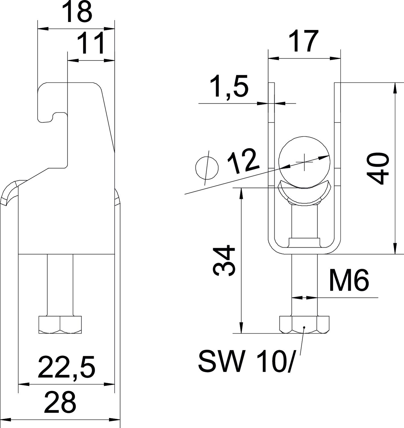 Produkta aprakstsPiekarapskava ar U veida kāju, metāla spiediena padziļinājums ar noapaļotām malām kabeļu aizsardzībai. 1 atsevišķa kabeļa vertikālai un horizontālai montāžai pie C veida profila sliedes. Griezuma diametram 18-22 mm. Ar viengājiena skrūvi pie spiediena padziļinājuma, universāla sešstūru skrūves galviņa SW10, ar rievu un krustiņu. Piemērota montāžai telpās un ārpus telpām. Ieteicams izmantot pretpadziļinājumu.