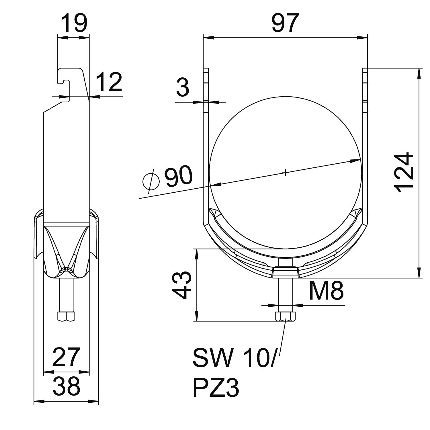 Ar metāla padziļinājumu jā Ar plastmasas padziļinājumu nē Ar prettvertni nē Ārējā izmēra garums 38 mm Augstums 124 mm caurules diametram maks. 90 mm caurules diametram min. 82 mm CO2 pēdas nospiedums (GWP) no šūpuļa līdz vārtiem 0,7018 kg CO2e / 1 Gabals Funkciju nodrošināšana jā Garums 27 mm griezuma diametrs 10 mm Izmērs 82-90mm Izmērs A 27 mm Izmērs B 97 mm Izmērs C 38 mm Izmērs G (mm) M8 Izmērs H 124 mm Izmērs L 43 mm Izmērs t 3 mm Kabeļu/ cauruļu skaits 1 Loksnes biezums 3 mm Maks. Pievilkšanas griezes moments 5 Nm Materiāls Tērauds Montāžas veids Profila sliede Nesatur halogēnus jā Papildu materiāls Tērauds Papildu virsma karsti cinkota Platums 97 mm sliedēm ar griezuma diametru (ar intervālu) maks. 22 mm sliedēm ar griezuma diametru (ar intervālu) min. 18 mm Spriegošanas diapazons D maks. 90 mm Spriegošanas diapazons D min. 82 mm Vannas materiāls Tērauds Virsma karsti cinkots Vītne M8 - Visi tipi