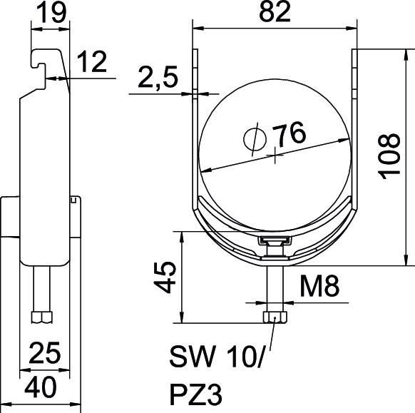 Ar plastmasas padziļinājumu jā Ar prettvertni nē Ārējā izmēra garums 40 mm Augstums 108 mm caurules diametram maks. 76 mm caurules diametram min. 70 mm CO2 pēdas nospiedums (GWP) no šūpuļa līdz vārtiem 0,4322 kg CO2e / 1 Gabals Garums 25 mm griezuma diametrs 10 mm Izmērs 70-76mm Izmērs A 25 mm Izmērs B 82 mm Izmērs C 40 mm Izmērs G (mm) M8 Izmērs H 108 mm Izmērs L 45 mm Izmērs t 2,5 mm Kabeļu/ cauruļu skaits 1 Loksnes biezums 2,5 mm Maks. Pievilkšanas griezes moments 5 Nm Materiāls Tērauds Montāžas veids Profila sliede Nesatur halogēnus jā Papildu materiāls Tērauds Papildu virsma karsti cinkota Platums 82 mm sliedēm ar griezuma diametru (ar intervālu) maks. 22 mm sliedēm ar griezuma diametru (ar intervālu) min. 18 mm Spriegošanas diapazons D maks. 76 mm Spriegošanas diapazons D min. 70 mm Vannas materiāla kvalitāte Polipropilēns Vannas materiāls Plastmasa Virsma karsti cinkots Vītne M8 - Visi tipi