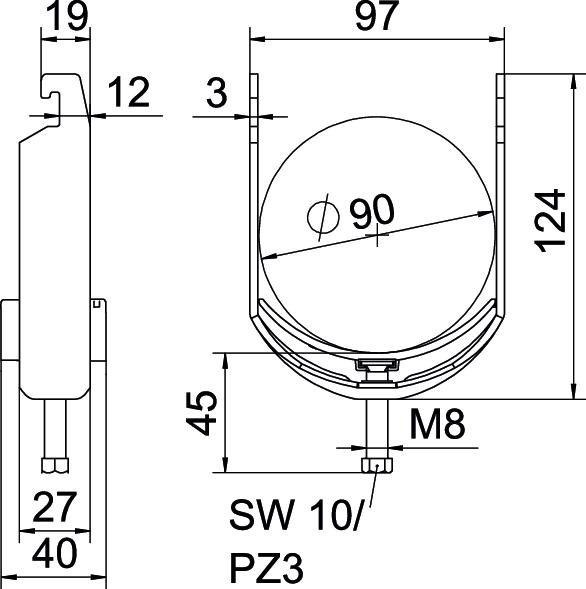 Ar plastmasas padziļinājumu jā Ar prettvertni nē Ārējā izmēra garums 40 mm Augstums 124 mm caurules diametram maks. 90 mm caurules diametram min. 82 mm CO2 pēdas nospiedums (GWP) no šūpuļa līdz vārtiem 0,6095 kg CO2e / 1 Gabals Garums 27 mm griezuma diametrs 10 mm Izmērs 82-90mm Izmērs A 27 mm Izmērs B 97 mm Izmērs C 40 mm Izmērs G (mm) M8 Izmērs H 124 mm Izmērs L 45 mm Izmērs t 3 mm Kabeļu/ cauruļu skaits 1 Loksnes biezums 3 mm Maks. Pievilkšanas griezes moments 5 Nm Materiāls Tērauds Montāžas veids Profila sliede Nesatur halogēnus jā Papildu materiāls Tērauds Papildu virsma karsti cinkota Platums 97 mm sliedēm ar griezuma diametru (ar intervālu) maks. 22 mm sliedēm ar griezuma diametru (ar intervālu) min. 18 mm Spriegošanas diapazons D maks. 90 mm Spriegošanas diapazons D min. 82 mm Vannas materiāla kvalitāte Polipropilēns Vannas materiāls Plastmasa Virsma karsti cinkots Vītne M8 - Visi tipi