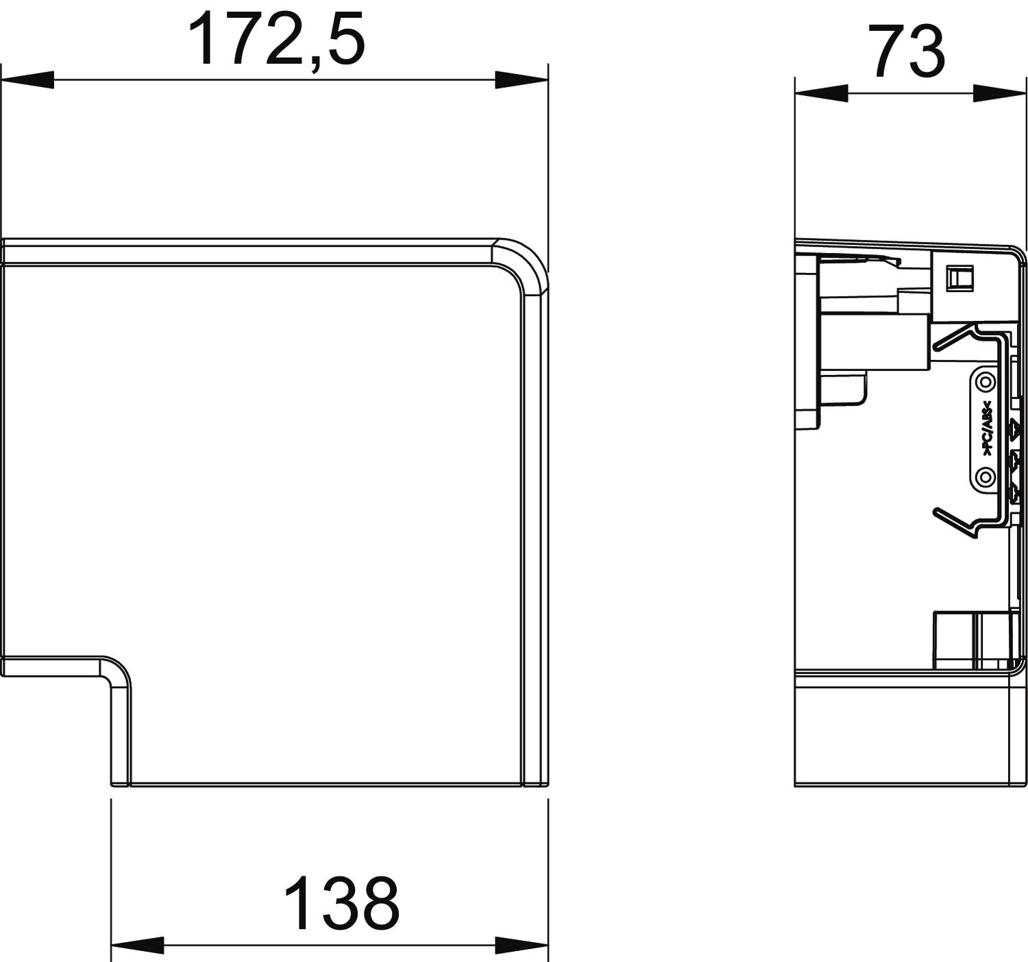Produkta aprakstsPlakanā leņķa profila pārsega fasondetaļa no PC/ABS, kas nesatur halogēnogļūdeņražus, vienkāršai virziena maiņai par 90° uz augšu vai uz leju ar sērijas Rapid 80 GK, GKH, GS un GA ierīču montāžas kanāliem. Plakana leņķa profila pārsega fasondetaļa tiek izmantota simetrisko un asimetrisko kanālu veidiem.