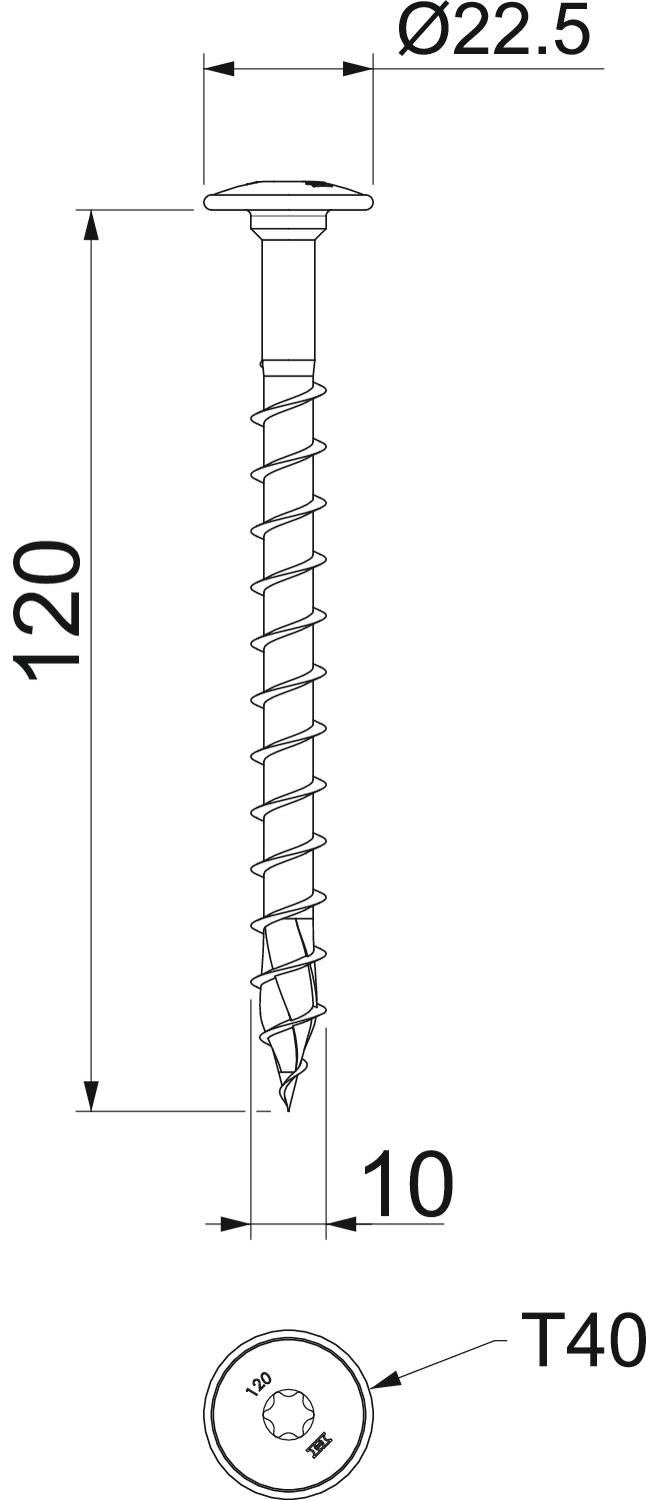 Divceļu nē Galvas diametrs 22,5 mm Galvas forma Apaļgalva Garums 120 mm Izmērs 10x120 Izmērs D 10 mm Izmērs L 120 mm Kāta diametrs 7 mm Krāsa cinks Materiāls Tērauds Rūdīts jā Skrūvēšanas sistēma Torx Virsma galvaniski cinkota - Visi tipi