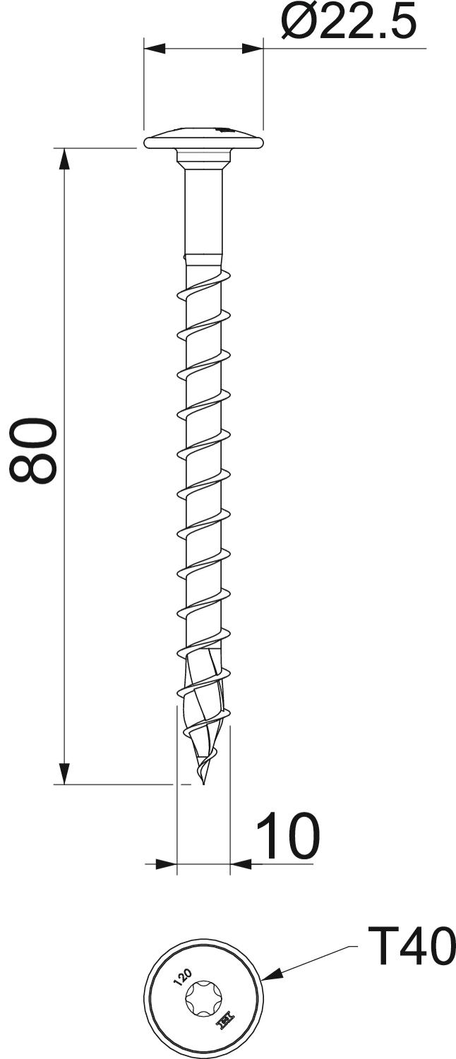 Divceļu nē Galvas diametrs 22,5 mm Galvas forma Apaļgalva Garums 80 mm Izmērs 10x80 Izmērs D 10 mm Izmērs L 80 mm Kāta diametrs 7 mm Krāsa cinks Materiāls Tērauds Rūdīts jā Skrūvēšanas sistēma Torx Virsma galvaniski cinkota - Visi tipi