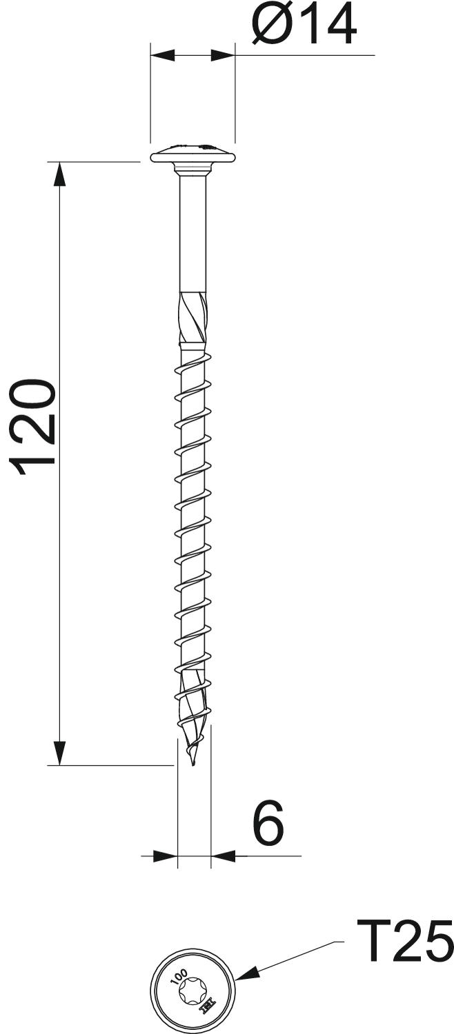 Divceļu nē Galvas diametrs 14 mm Galvas forma Apaļgalva Garums 120 mm Izmērs 6x120 Izmērs D 6 mm Izmērs L 120 mm Kāta diametrs 4,5 mm Krāsa cinks Materiāls Tērauds Rūdīts jā Skrūvēšanas sistēma Torx Virsma galvaniski cinkota - Visi tipi