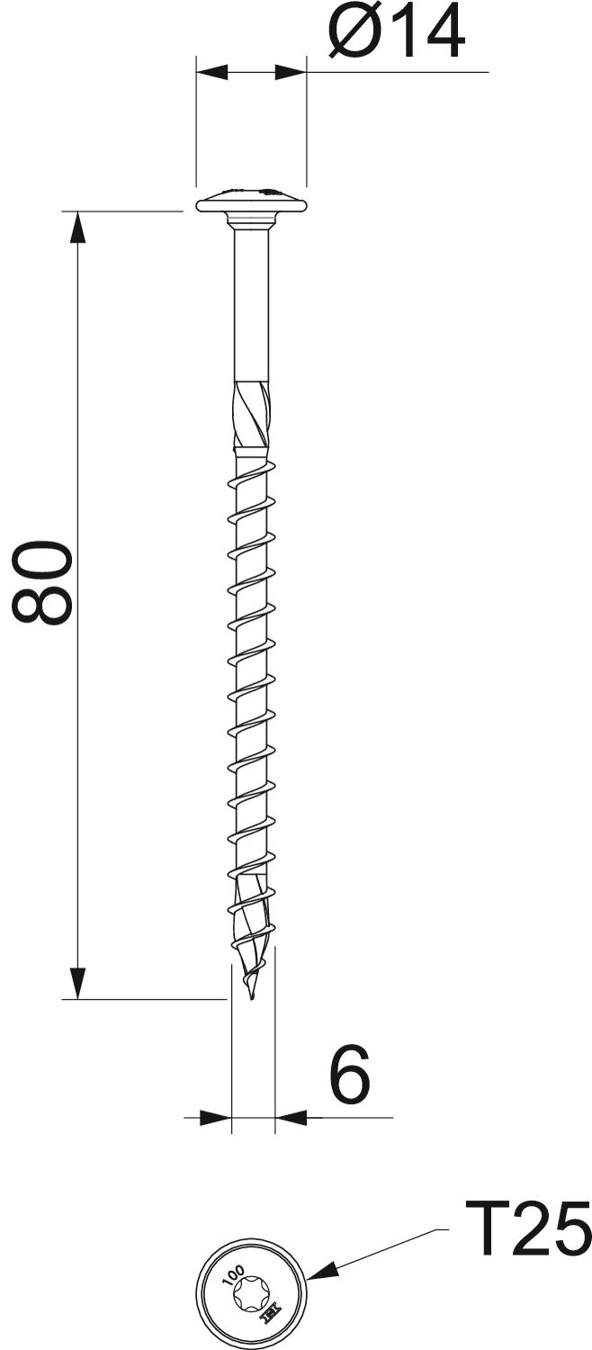 Divceļu nē Galvas diametrs 14 mm Galvas forma Apaļgalva Garums 80 mm Izmērs 6x80 Izmērs D 6 mm Izmērs L 80 mm Kāta diametrs 4,5 mm Krāsa cinks Materiāls Tērauds Rūdīts jā Skrūvēšanas sistēma Torx Virsma galvaniski cinkota - Visi tipi