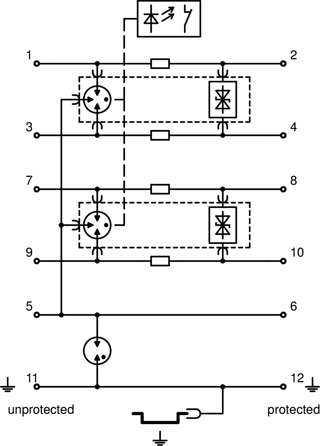 Aizsardzības līmenis dzīsla–dzīsla 130 V Aizsardzības līmenis dzīsla–zeme 1600 V Aizsardzības līmenis ekrāns–zeme (S-PE) 1300 V Aizsardzības veids IP20 Augstākais ilgtermiņa spriegums AC 12 V Augstākais ilgtermiņa spriegums DC 16 V Augstums 95 mm CO2 pēdas nospiedums (GWP) no šūpuļa līdz vārtiem 0,7889 kg CO2e / 1 Gabals Ekrāna pieslēgums jā Ekranējums netieši Gareniskā pretestība 1.2 ± 5% Garums 75 mm Ieejas / izejas montāža Skrūvējamas spailes Ierīces signalizācija nav Ievietotā slāpēšana (Insertion loss) ≤3 dB Impulsstrāva 2,5 kA Impulsu strāvas caurlaidība, stieple-stieple 10 kV / 5 kA Impulsu strāvas caurlaidība, stieple–zeme 10 kV / 5 kA Izmantošanas temperatūras diapazons maks. 80 °C Izmantošanas temperatūras diapazons min. -40 °C Izmērs 12V Izpildījums 2x2-pole Kapacitāte (dzīsla-dzīsla) ≤30 pF Kapacitāte (dzīsla-zemējums) ≤30 pF Kategorie 1. + 2. tips/D1 + C2 Kopējā impulsu strāva novadītājā (10/350) 2,5 kA Kopējā impulsu strāva novadītājā (8/20) 20 kA LPZ 0→2 Nominālā noplūdes strāva (8/20 µs) 10 kA Nominālā noslogojuma strāva, AC 0,425 A Nominālā noslogojuma strāva, DC 0,6 A Nominālā zibensizlādes strāva In aiz C2 (kopā) 20 kA Pārbaudes standarts IEC 61643-21 Pieslēguma diametrs, elastīgs maks. 1,5 mm² Pieslēguma diametrs, elastīgs min. 0,14 mm² Pieslēguma diametrs, vairākdzīslu maks. 2,5 mm² Pieslēguma diametrs, vairākdzīslu min. 0,14 mm² Platums 17,5 mm Polu skaits 4 Robežfrekvence 100 MHz SPD atb. I + II klase/D1 + C2 SPD atb. EN 61643-11 Tips 1+2 SPD atb. IEC 61643-1 I+II klase Spraudsistēma Spaile Stacionārā pieslēguma šķērsgriezums maks. 2,5 mm² Stacionārā pieslēguma šķērsgriezums min. 0,14 mm² Virknes pretestība katrai stieplei 1,2 Ω ± 5% Zemējums ar: Pieslēguma vads / U profila sliede - Visi tipi