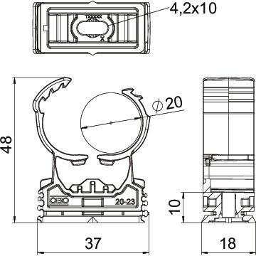 Produkta aprakstsHighly stressable clip for accepting plastic or metal electrical and sanitary pipes as well as the electrical installation pipe Quick pipe. Universal fastening options on walls, ceilings and steel constructions, both indoors and outdoors. Flexible clamping range of several millimetres. Toolless pipe mounting. Connectable to each other to Ø 32 mm, also with the OBO Quick or Multi Quick clip. For variable distances and clip quantity mountable on a profile rail.