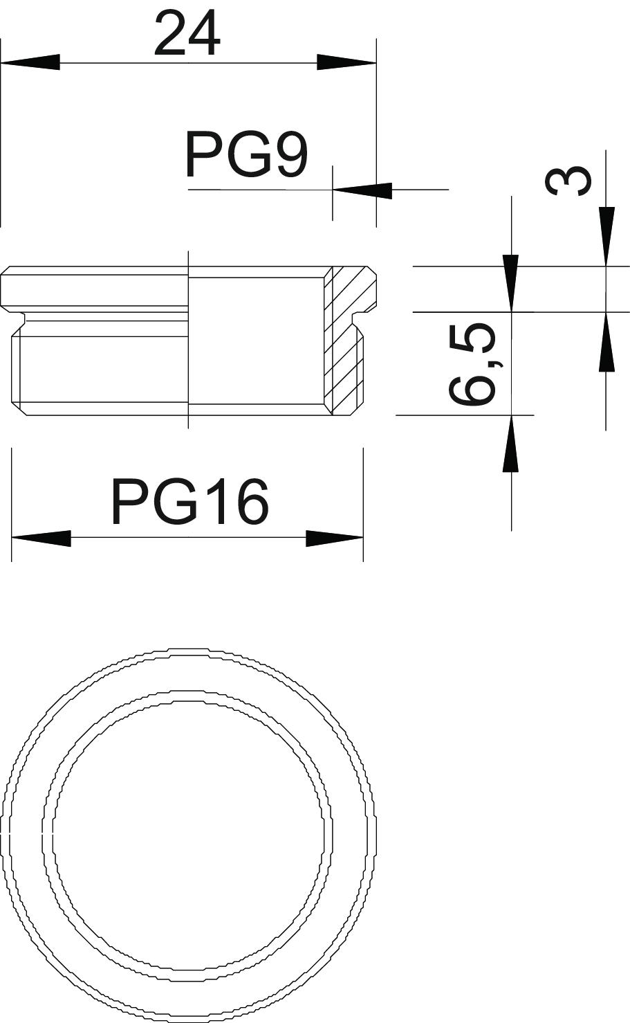 Produkta aprakstsDiametru samazinošs elements (daļa H) atb. DIN 46320, ar PG vītni atb. DIN 40430, pārejai no atveres ar PG vītni uz mazāka diametra kabeļu skrūvsavienojumu.