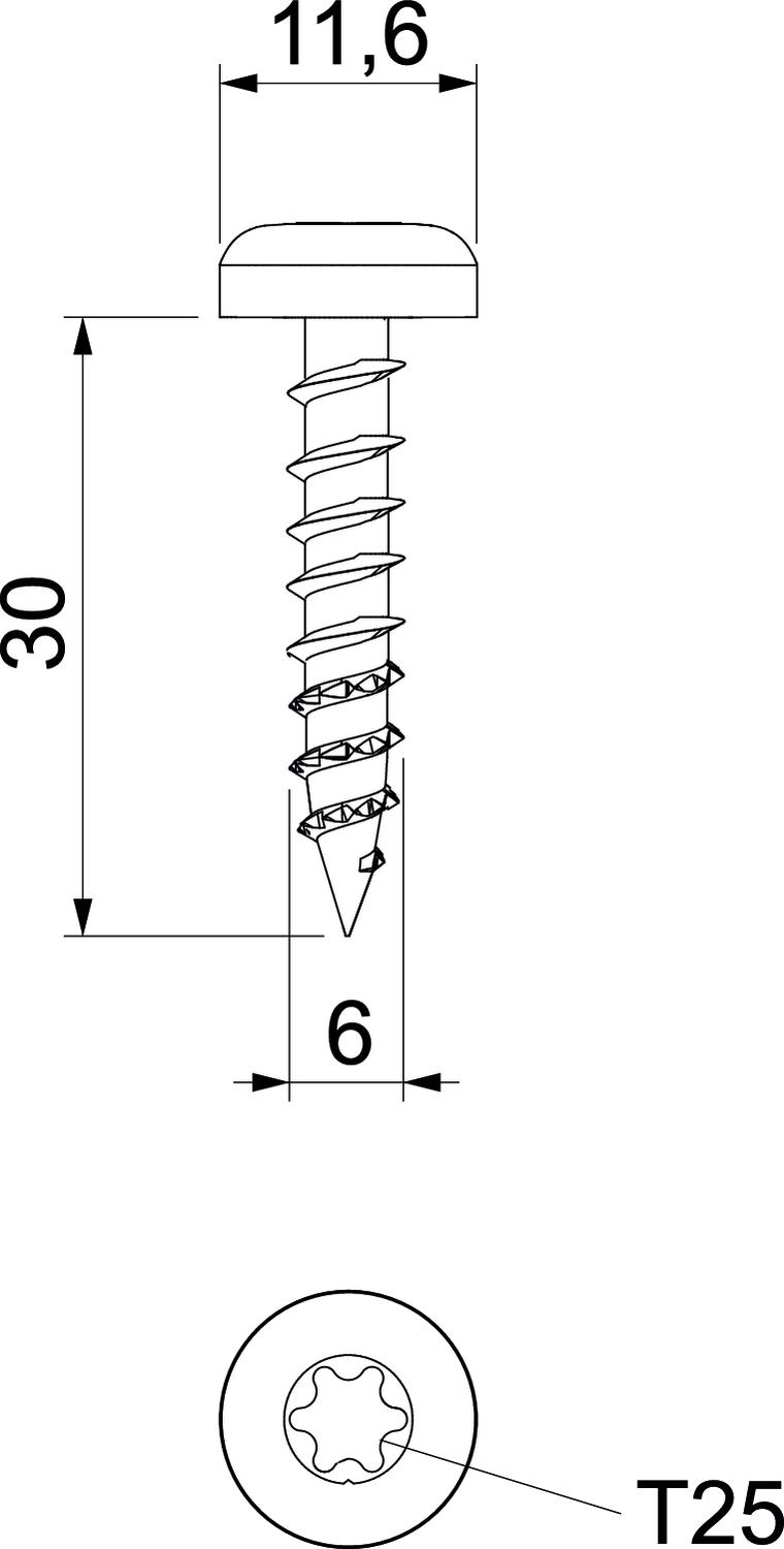 Galvas forma Citi Izmērs 6x30 Izmērs d 6 mm Izmērs D 11,6 mm Izmērs L 30 mm Krāsa cinks Materiāls Tērauds Skrūvēšanas sistēma Torx Virsma galvaniski cinkota, caurspīdīgi pasivēta Vītnes diametrs ST 6 - Visi tipi