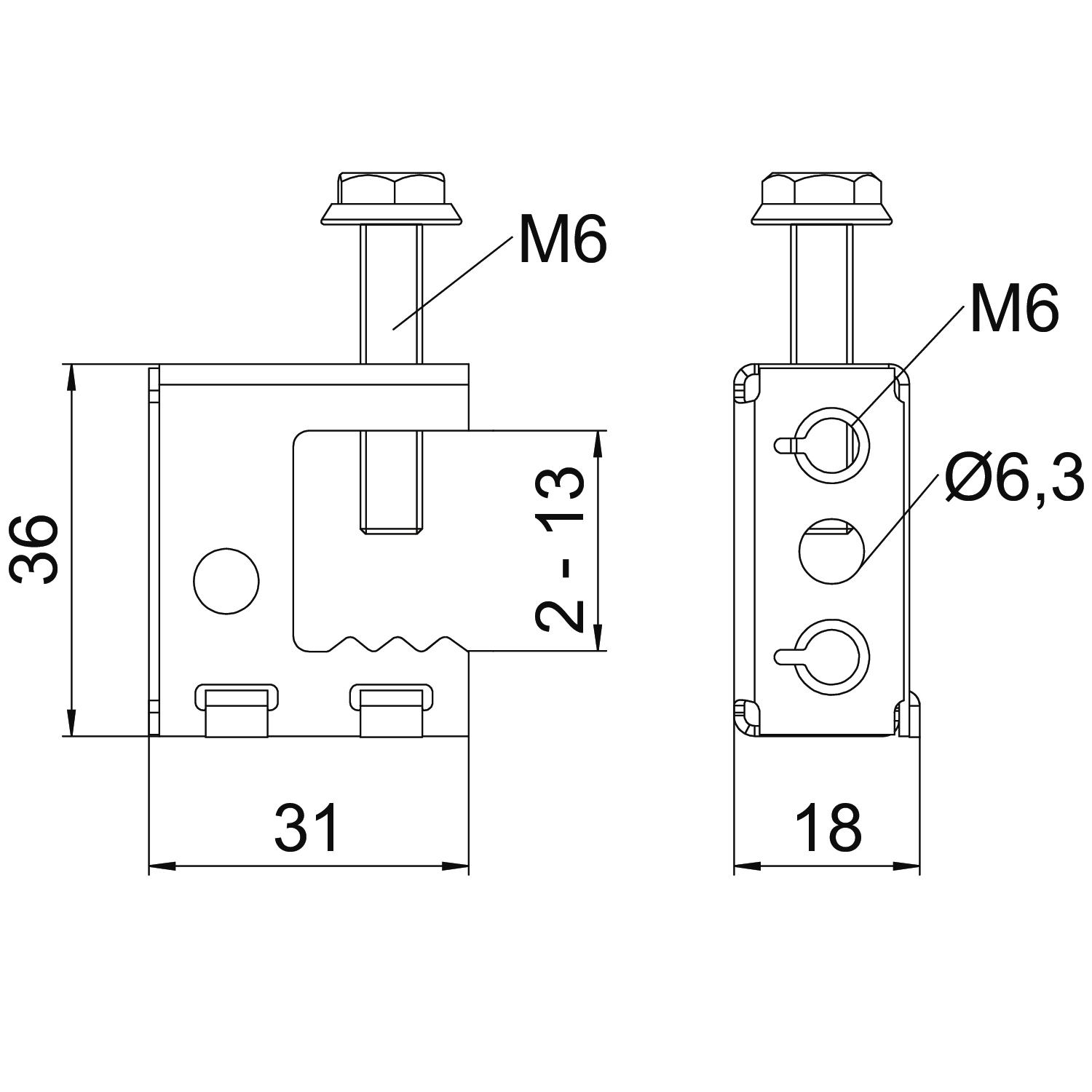 Ar eņģēm nē Atloka biezums F maks. 16 mm Atloka biezums F min. 2 mm Augstums 36 mm Eņģes, regulējamas nē Garums 31 mm Izmērs 2-13mm Krāsa cinks Materiāls Tērauds Metriskā vītne 6 Min. pārraušanas spēks 0,55 kN Pievienojuma veids / būvdetaļa Citi Platums 18 mm Stiprinājuma veids Skrūves Virsma Cinka lamele Vītne M6 - Visi tipi