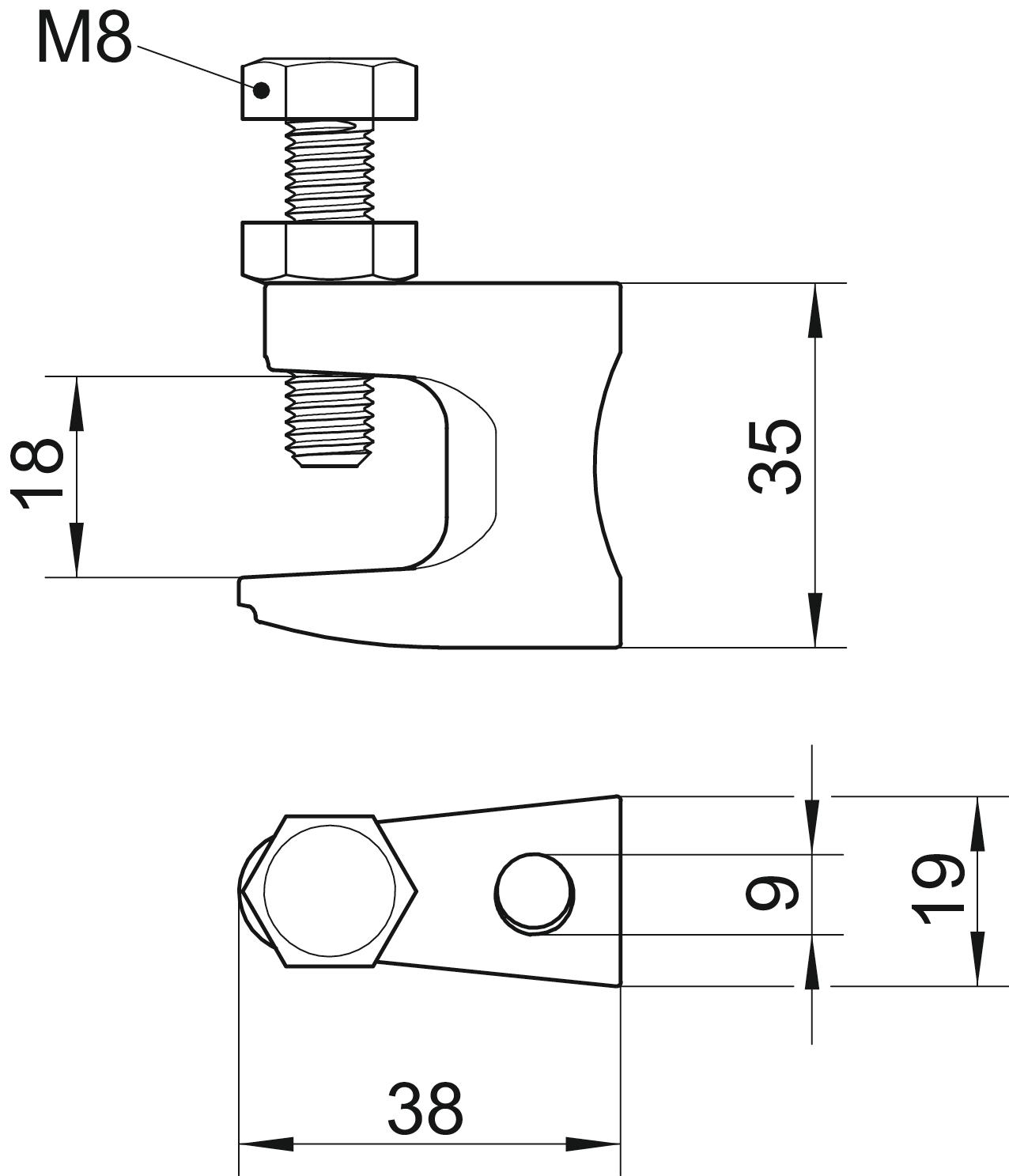 Ar eņģēm nē Atloka biezums F maks. 18 mm Augstums 35 mm Eņģes, regulējamas nē Garums 38 mm Izmērs 0-17mm Izmērs B 19 mm Izmērs D 9 mm Izmērs F 18 mm Izmērs G (mm) M8 Izmērs H 35 mm Izmērs L 38 mm Maks. Pievilkšanas griezes moments 8 Nm Materiāls Kaļamais čuguns Metriskā vītne 8 Min. pārraušanas spēks 1,2 kN Pievienojuma veids / būvdetaļa Caurums Platums 19 mm Stiprinājuma veids Skrūves Stiprināšanas caurums 9 mm Vītne M8 - Visi tipi