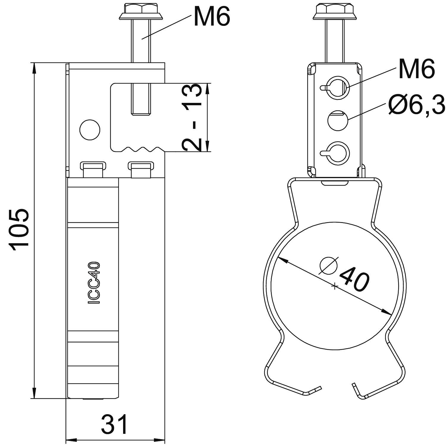 Ar eņģēm jā Atloka biezums F maks. 16 mm Atloka biezums F min. 2 mm Augstums 105 mm Caurules/kabeļa diametrs maks. 40 mm Caurules/kabeļa diametrs min. 36 mm Eņģes, regulējamas nē Garums 31 mm Izmērs 2-13mm Izmērs H 105 mm Krāsa cinks Materiāls Tērauds Min. pārraušanas spēks 0,45 kN Pievienojuma veids / būvdetaļa Caurule/kabelis Platums 44 mm Stiprinājuma veids Spailes Virsma Cinka lamele - Visi tipi