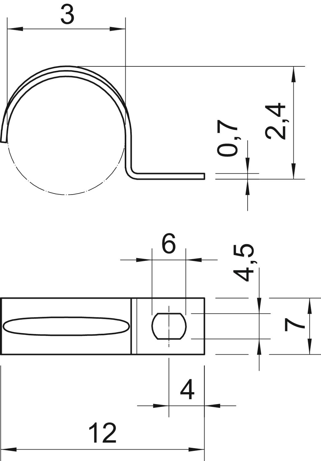 ar plastmasas apvalku nē Atstatums līdz sienai nē Augstums 2,4 mm Cauruma lielums 4,5 x 6 mm CO2 pēdas nospiedums (GWP) no šūpuļa līdz vārtiem 0,0023 kg CO2e / 1 Gabals diametram 3 Garums 12 mm Izmērs e 6 mm Izmērs 3mm Izmērs A 4 mm Izmērs b 7 mm Izmērs D 3 mm Izmērs d 4,5 mm Izmērs H 2,4 mm Izmērs L 12 mm Izmērs t 0,7 mm Izpildījums vienkārtīgs Kabeļu/ cauruļu skaits 1 Materiāla biezums 0,7 mm Materiāls Tērauds Nesatur halogēnus jā Nominālais diametrs 3 mm Piemērots ugunsdrošības zonai nē Platums 7 mm Stiprinājuma veids Caurums skrūvēšanai UV izturīgs jā Virsma galvaniski cinkota - Visi tipi