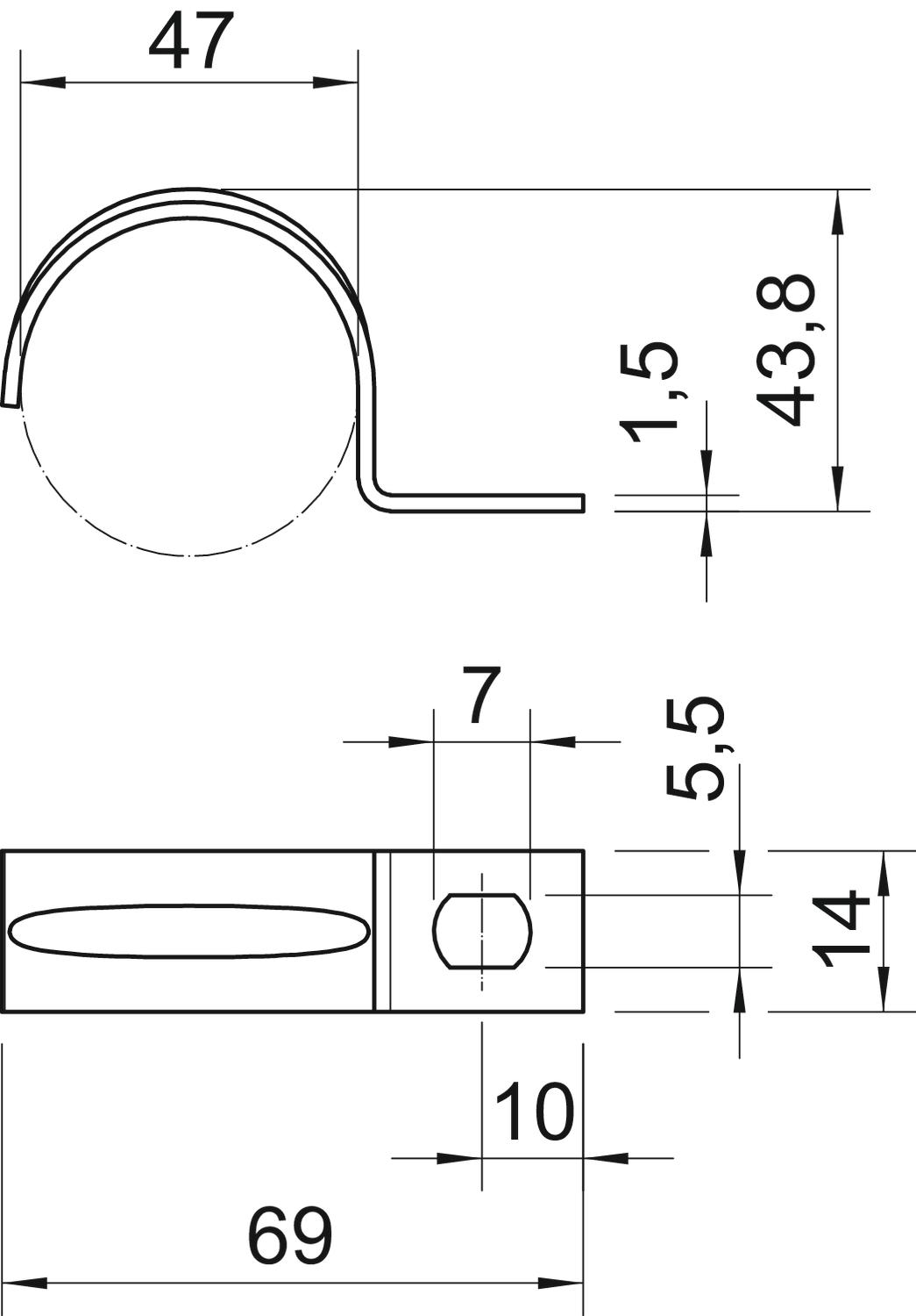 ar plastmasas apvalku nē Atstatums līdz sienai nē Augstums 43,8 mm Cauruma lielums 5,5 x 7 mm CO2 pēdas nospiedums (GWP) no šūpuļa līdz vārtiem 0,0433 kg CO2e / 1 Gabals diametram 47 Garums 69 mm Izmērs e 7 mm Izmērs 47mm Izmērs A 10 mm Izmērs b 14 mm Izmērs d 5,5 mm Izmērs D 47 mm Izmērs H 43,8 mm Izmērs L 69 mm Izmērs t 1,5 mm Izpildījums vienkārtīgs Kabeļu/ cauruļu skaits 1 Materiāla biezums 1,5 mm Materiāls Tērauds Nesatur halogēnus jā Nominālais diametrs 47 mm Piemērots ugunsdrošības zonai nē Platums 14 mm Stiprinājuma veids Caurums skrūvēšanai UV izturīgs jā Virsma galvaniski cinkota - Visi tipi