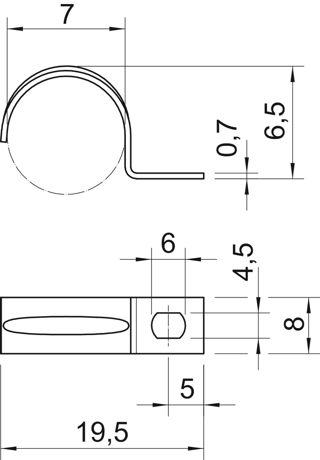 ar plastmasas apvalku nē Atstatums līdz sienai nē Augstums 6,5 mm Cauruma lielums 4,5 x 6 mm CO2 pēdas nospiedums (GWP) no šūpuļa līdz vārtiem 0,0038 kg CO2e / 1 Gabals diametram 7 Garums 19,5 mm Izmērs e 6 mm Izmērs 7mm Izmērs A 5 mm Izmērs b 8 mm Izmērs D 7 mm Izmērs d 4,5 mm Izmērs H 6,5 mm Izmērs L 19,5 mm Izmērs t 0,7 mm Izpildījums vienkārtīgs Kabeļu/ cauruļu skaits 1 Materiāla biezums 0,7 mm Materiāls Tērauds Nesatur halogēnus jā Nominālais diametrs 7 mm Piemērots ugunsdrošības zonai nē Platums 8 mm Stiprinājuma veids Caurums skrūvēšanai UV izturīgs jā Virsma galvaniski cinkota - Visi tipi