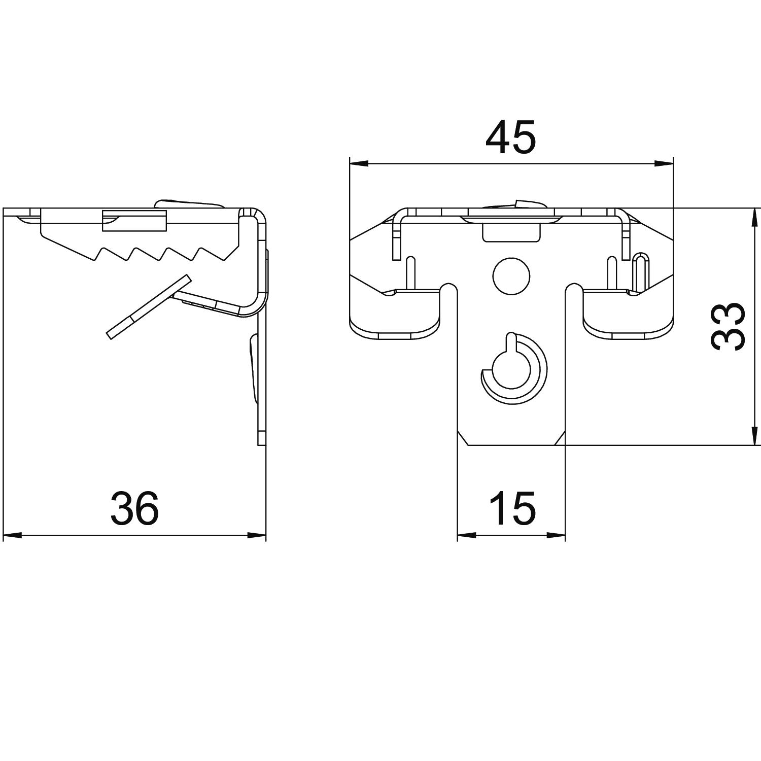 Ar eņģēm nē Atloka biezums F maks. 7 mm Atloka biezums F min. 3 mm Augstums 36 mm Eņģes, regulējamas nē Garums 33 mm Izmērs 3-7mm Izmērs L 33 mm Krāsa cinks Materiāls Tērauds Metriskā vītne 6 Min. pārraušanas spēks 0,45 kN Pievienojuma veids / būvdetaļa Vītne Platums 45 mm Stiprinājuma veids Spailes Virsma Cinka lamele - Visi tipi