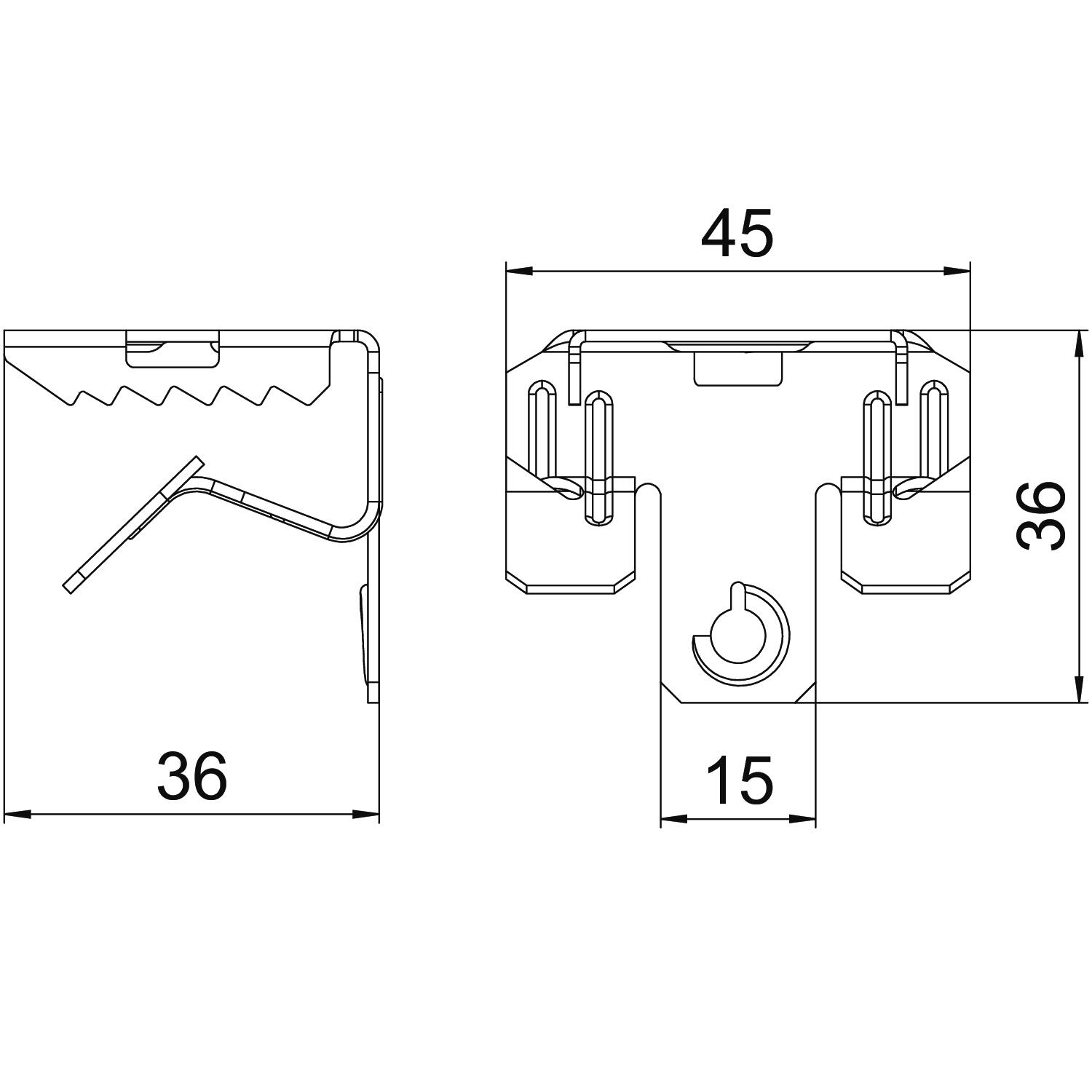 Ar eņģēm nē Atloka biezums F maks. 13 mm Atloka biezums F min. 7 mm Augstums 36 mm Eņģes, regulējamas nē Garums 36 mm Izmērs 7-13mm Izmērs L 36 mm Krāsa cinks Materiāls Tērauds Metriskā vītne 6 Min. pārraušanas spēks 0,45 kN Pievienojuma veids / būvdetaļa Vītne Platums 45 mm Stiprinājuma veids Spailes Virsma Cinka lamele - Visi tipi