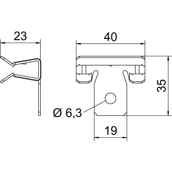 Ar eņģēm nē Atloka biezums F maks. 10 mm Atloka biezums F min. 4 mm Augstums 23 mm Dimension W 40 mm Eņģes, regulējamas nē Garums 35 mm Izmērs 4-10mm Izmērs L 35 mm Krāsa cinks Materiāls Tērauds Min. pārraušanas spēks 0,95 kN Pievienojuma veids / būvdetaļa Caurums Platums 40 mm Stiprinājuma veids Spailes Stiprināšanas caurums 6,5 mm Virsma Cinka lamele - Visi tipi