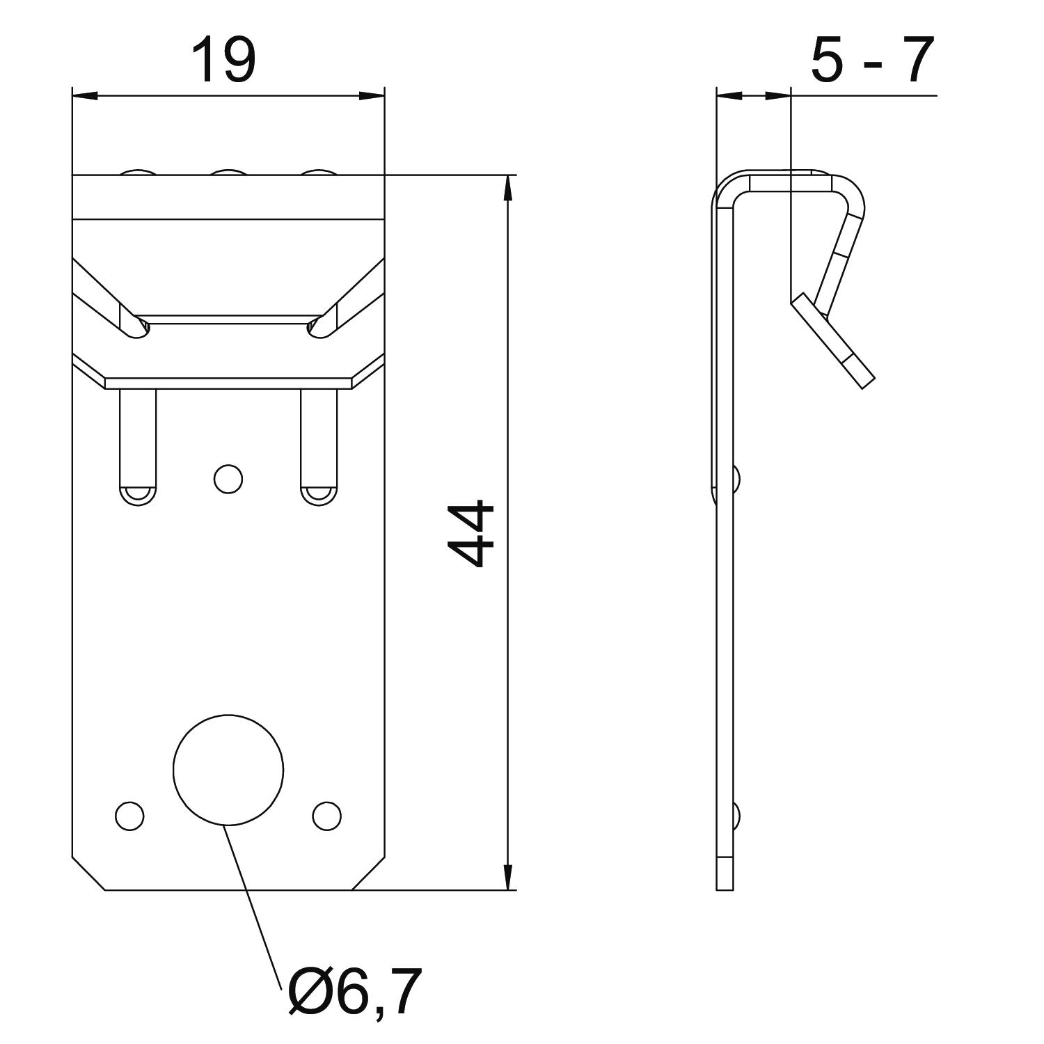 Ar eņģēm nē Atloka biezums F maks. 7 mm Atloka biezums F min. 5 mm Augstums 10 mm Eņģes, regulējamas nē Garums 43,5 mm Izmērs 5-7mm Krāsa cinks Materiāls Tērauds Min. pārraušanas spēks 0,72 kN Pievienojuma veids / būvdetaļa Caurums Platums 19 mm Stiprinājuma veids Spailes Virsma Cinka lamele - Visi tipi