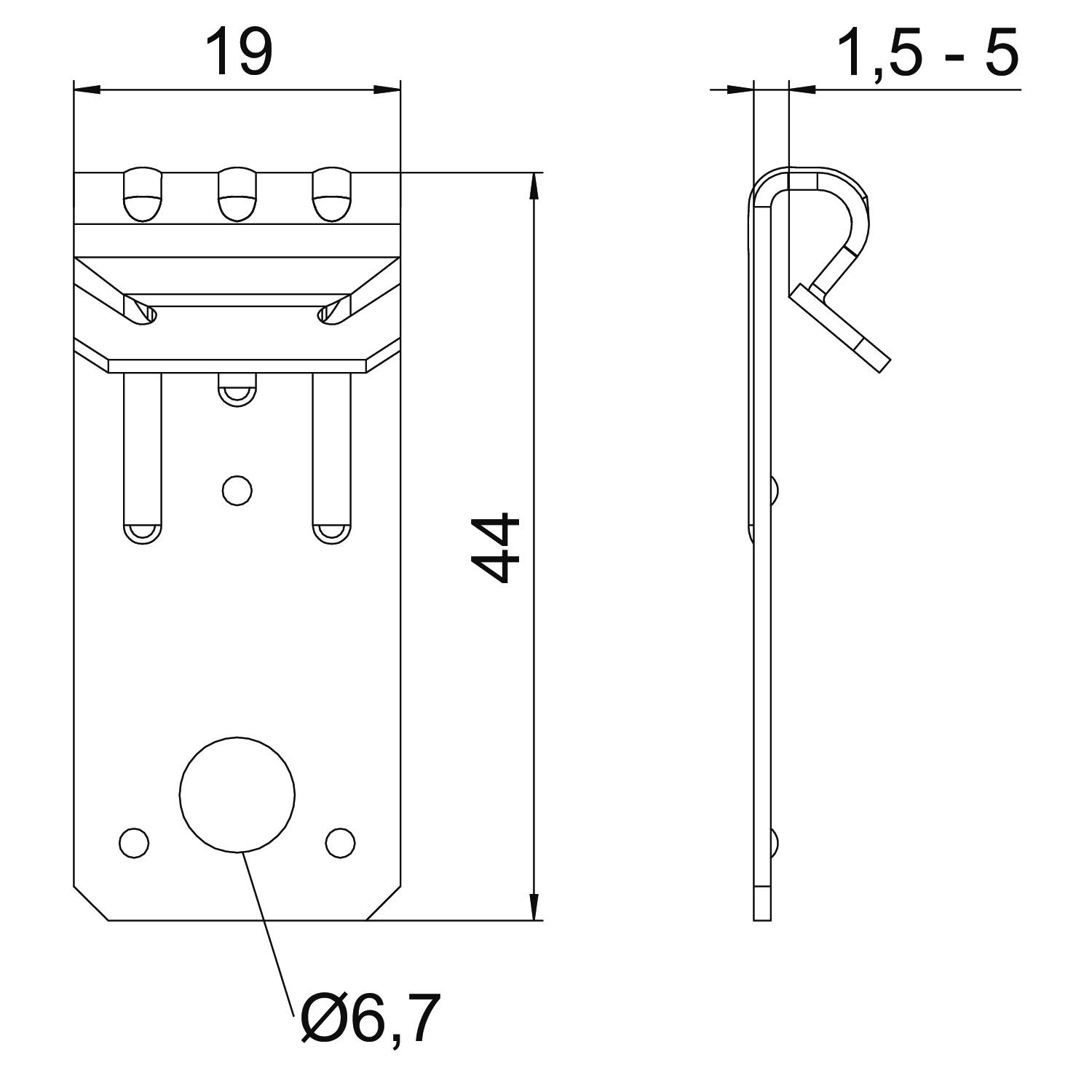 Ar eņģēm nē Atloka biezums F maks. 5 mm Atloka biezums F min. 1,5 mm Augstums 8 mm Eņģes, regulējamas nē Garums 44 mm Izmērs 1,5-5mm Krāsa cinks Materiāls Tērauds Min. pārraušanas spēks 0,72 kN Pievienojuma veids / būvdetaļa Caurums Platums 19 mm Stiprinājuma veids Spailes Virsma Cinka lamele - Visi tipi